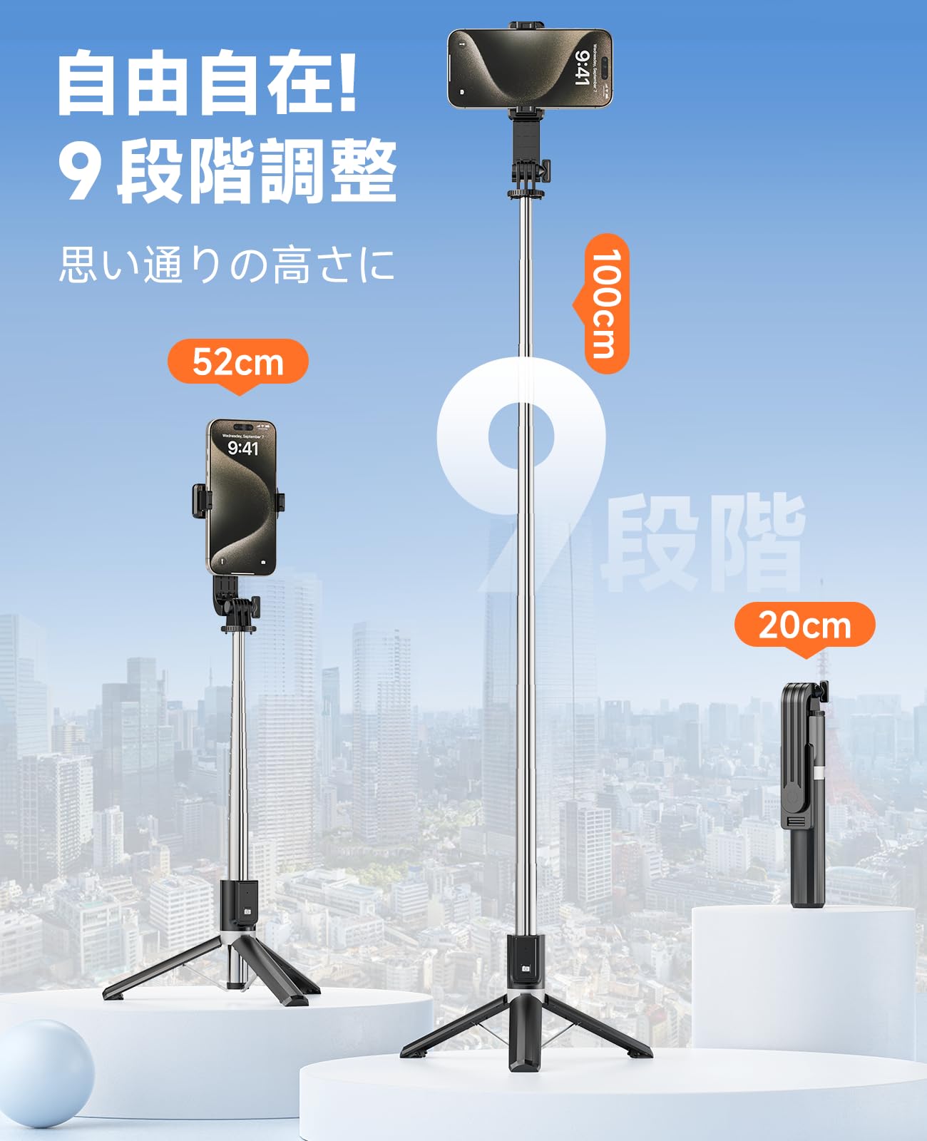 自撮り棒【新登場・ミニ三脚 スマホスタンド 三脚 じどり棒 軽量コンパクト 伸縮式最小20cm iphone&android対応 360°自由調整 9段階伸縮 リモコン (10m遠隔操作対応) 携帯スタンド セルカ棒 セルフィー 旅行/動画撮影/生放送/Vlogに最適 日本語説明書付属 Black (ブラック)