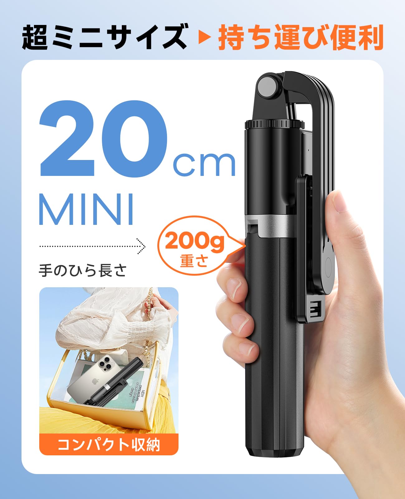 【超軽量200g&コンパクト設計】 2025最新モデル登場!最軽量わずか200gの超軽量設計で、持ち運びに最適。9段階伸縮式で最大95cmまで延長でき、折りたたみ時はたった20cmとコンパクト。500mlペットボトルより小さく、カバンやポケットにもすっぽり収まります。旅行やVlog、セルフィーや日常撮影まで、いつでもどこでも活躍するスマホスタンド一体型カメラ用卓上三脚ミニ三脚自撮り棒です。