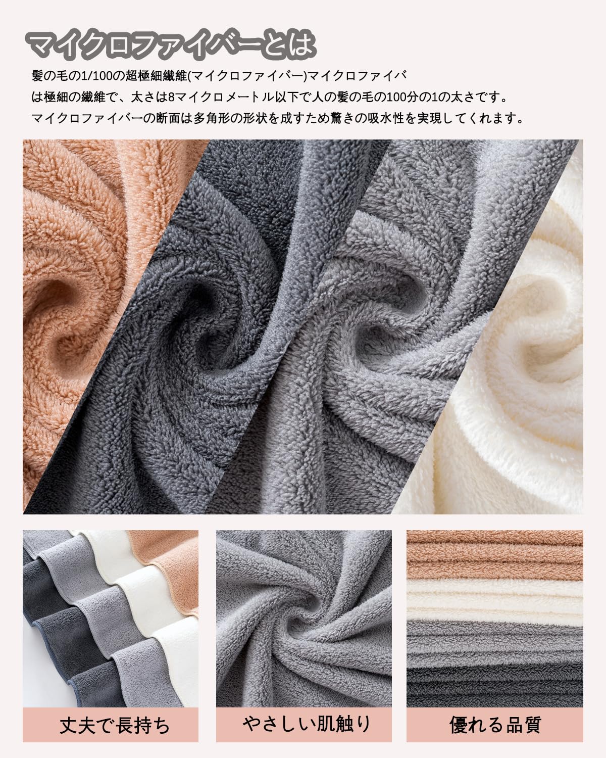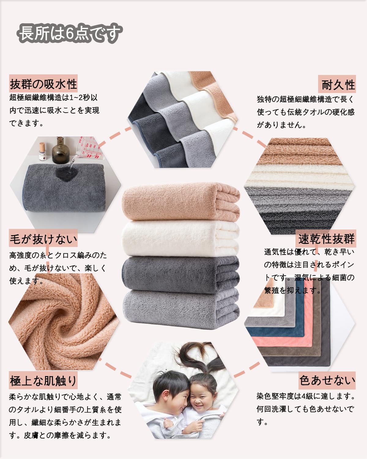 【バスタオル 4色4枚セット】サイズ:約70×140cm、重量:約300g(1枚あたり)セット内容: ライトグレー1枚+アイボリー1枚+グレー1枚+モカブラウン1枚。出張、旅行、入浴、ご家族皆さんが満足できます、様々な場合で活躍。