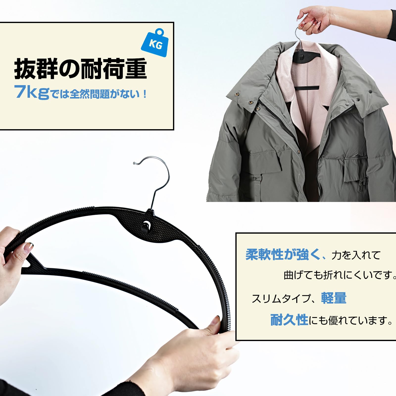 【高品質耐久性持ちハンガー 】柔軟性が強く、力を入れて、曲げても折れにくいです。スリムタイプ、軽量、耐久性にも優れています。どんな家庭でも重宝されることに間違いないです。