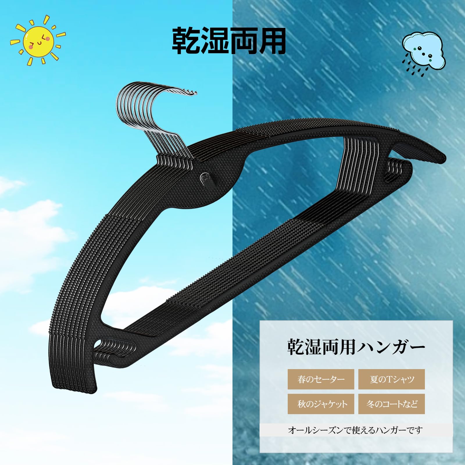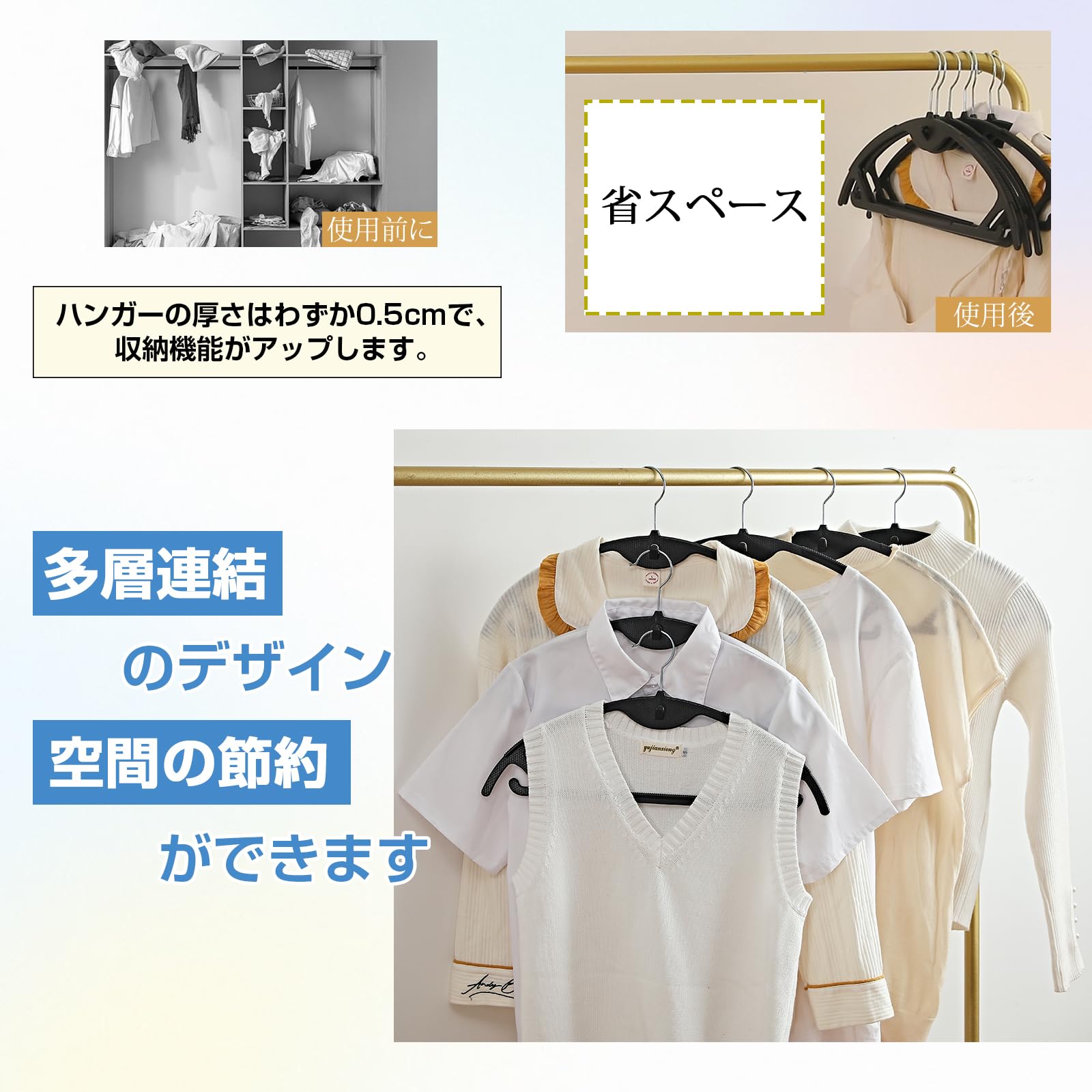 【洗濯物にも【省スペース】ハンガーの厚さはわずか0.5cmで、収納機能がアップします。ハンガーの上の側面に連結用フックが付いているで、通常のハンガーに比べて、クローゼットにすっきりと収納でき、もっと多くの空間を節約できます。使える乾湿両用ハンガー】濡れた衣類にも乾いた衣類にも使えるので、乾いた洗濯物をハンガーにかけたままクローゼットに収納も可能です。
