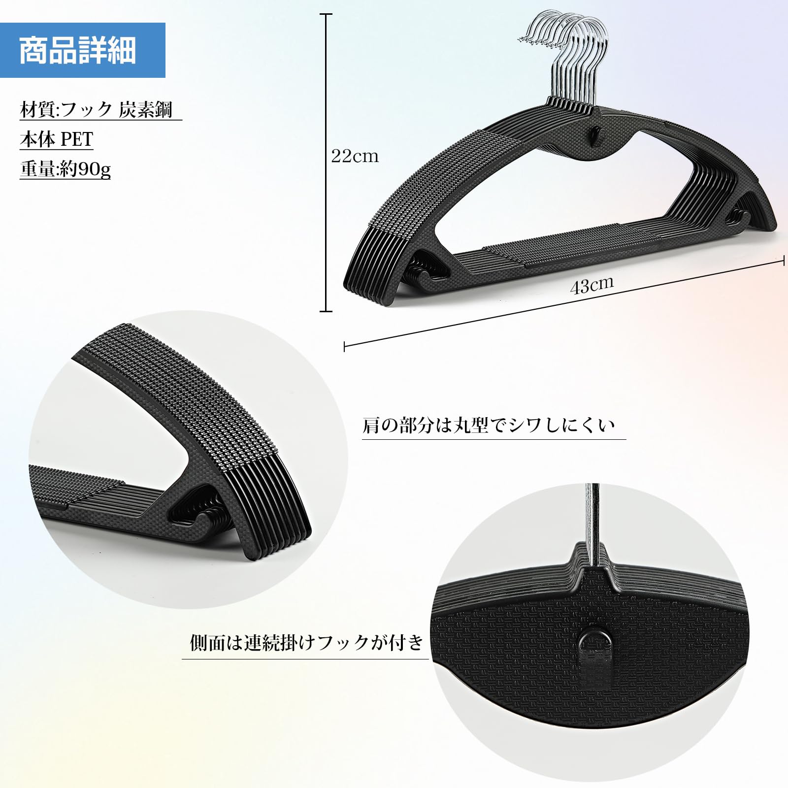 【すべらないハンガー&多機能】ハンガーの肩部分と下側は3か所に滑り止めの材質が付いていて、衣類をしっかりキップできる滑らないハンガーです!Tシャツ、セーター、コート、スカート、洋服はもちろん、ズボン、タオル、マフラーでも大丈夫です。ハンガーの下に小さいフックが、キャミソールも掛けられます。