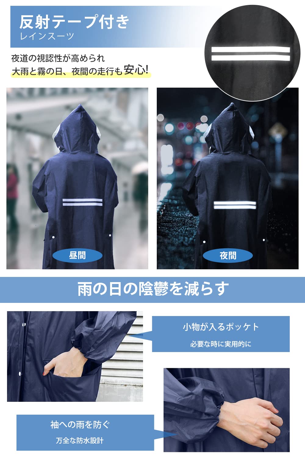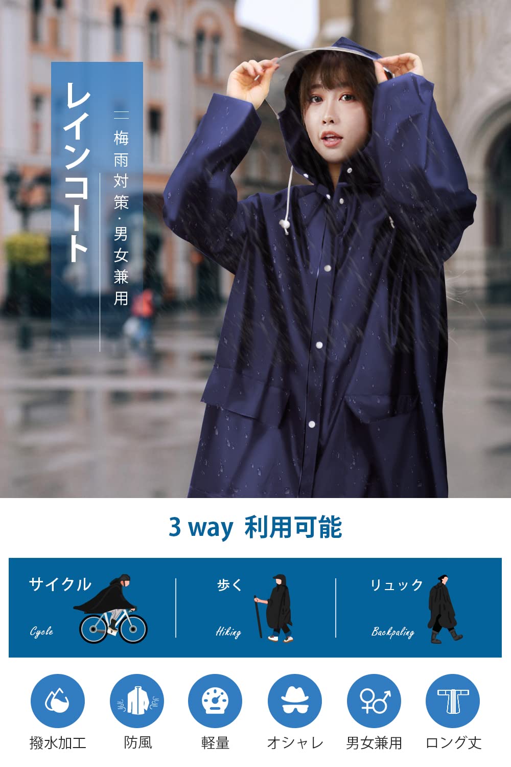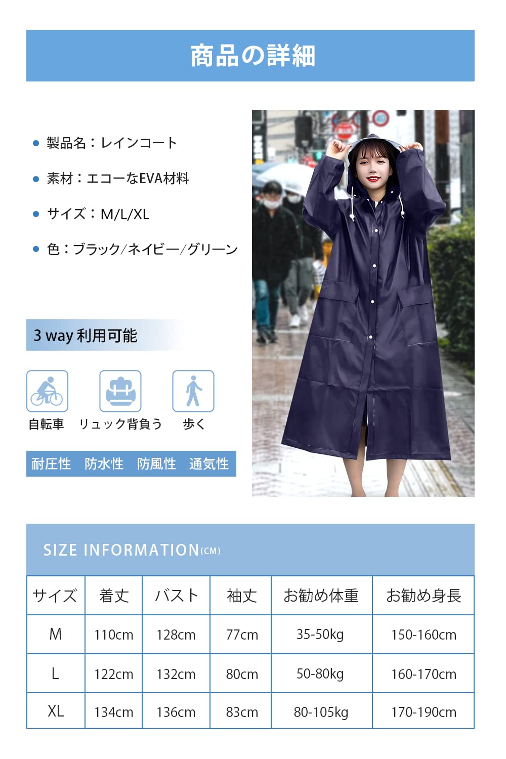 【男女兼用大きいサイズ】レインコートは膝下までカバーするロング丈、体をしっかり覆い、レインブーツを履けば足元まで濡れない、雨から全身を守ることができます。背中のスナップボタンを開けるとさらに余裕のある大きめサイズになり、リュックやバッグを背負ったままでもゆったりと着れます。自転車/バイクを乗る時にも、雨中での作業時にも邪魔せず、台風、梅雨季節に大活躍なレインコートです。