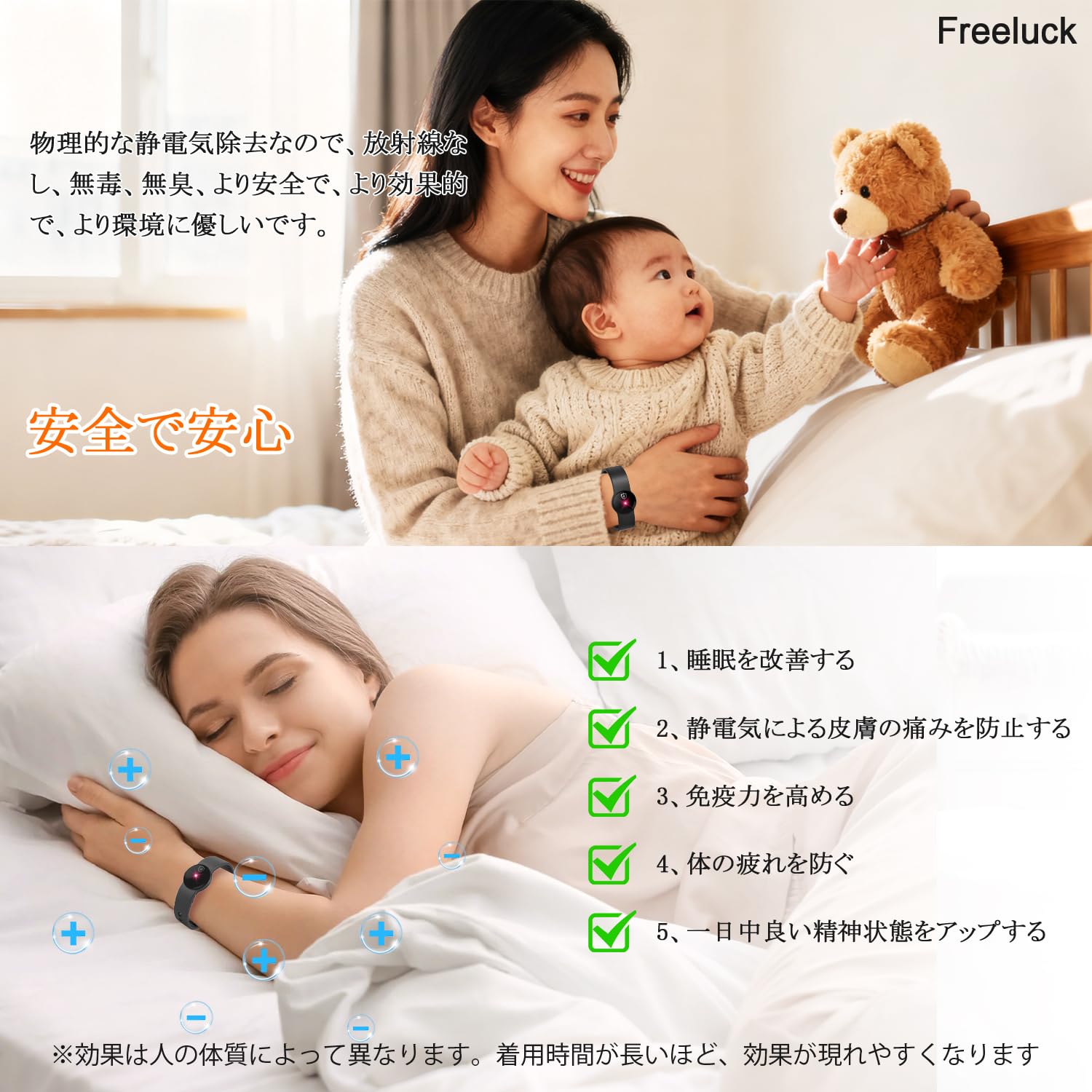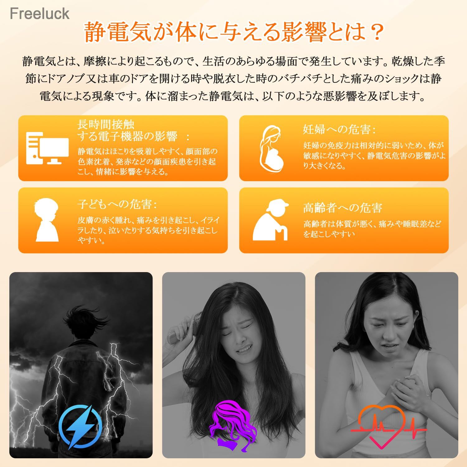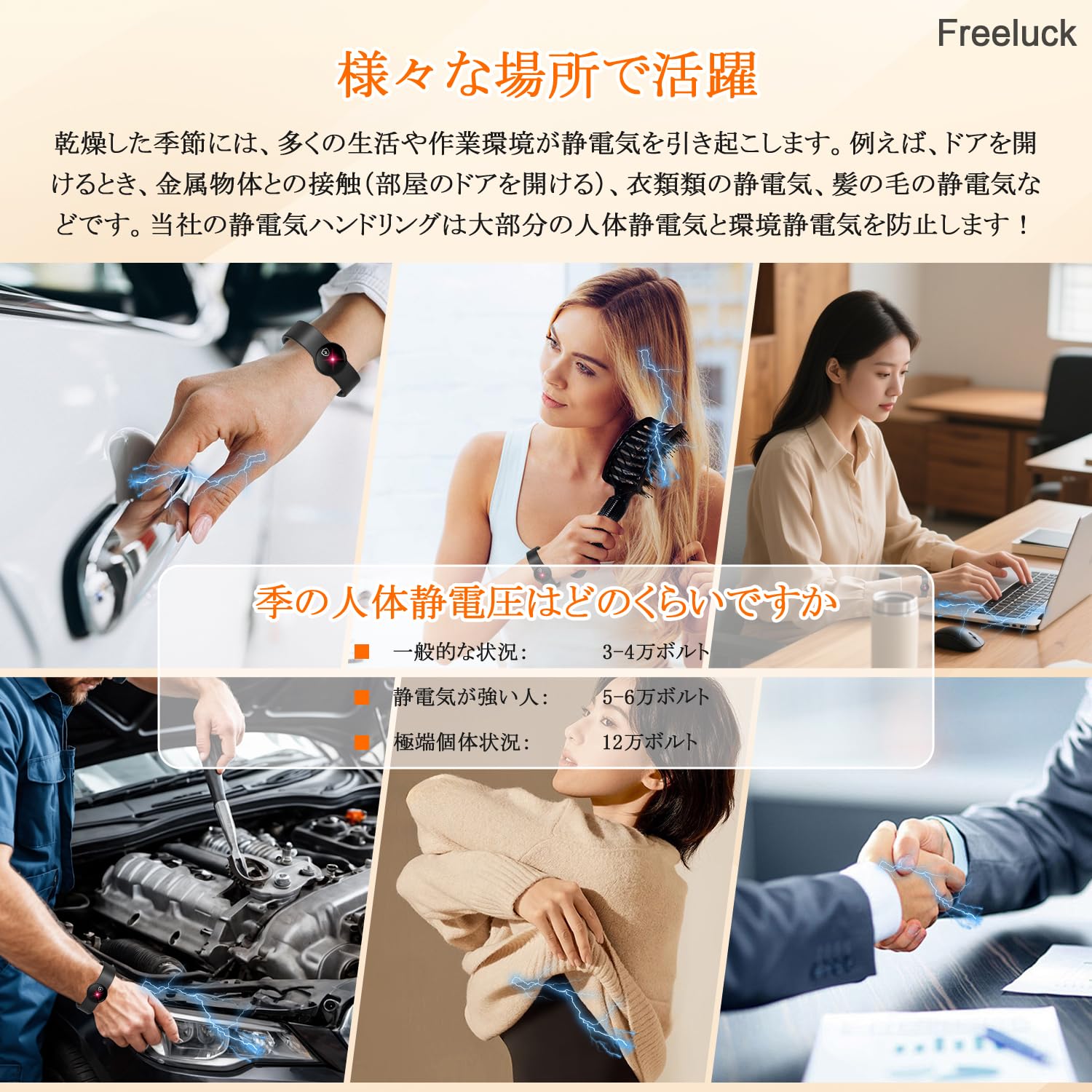 ?【2025冬業界Newモデル&Freeluck独自開発静電気除去 ブレスレット】乾燥した天気に悩んだことはありますか?静電気に刺激されてパチパチ痛む。Freeluck独自開発の静電気除去ブレスレットは、電極チップを肌に密着させ、静電気を吸収して特殊な技術加工を施した光源点に放出することで放電を吸収し、空気中に放電することで、完全に静電気を除去!静電気があると赤信号が点滅し、静電気を放出していることを示します。快適な生活を、静電気ゼロから始まる。