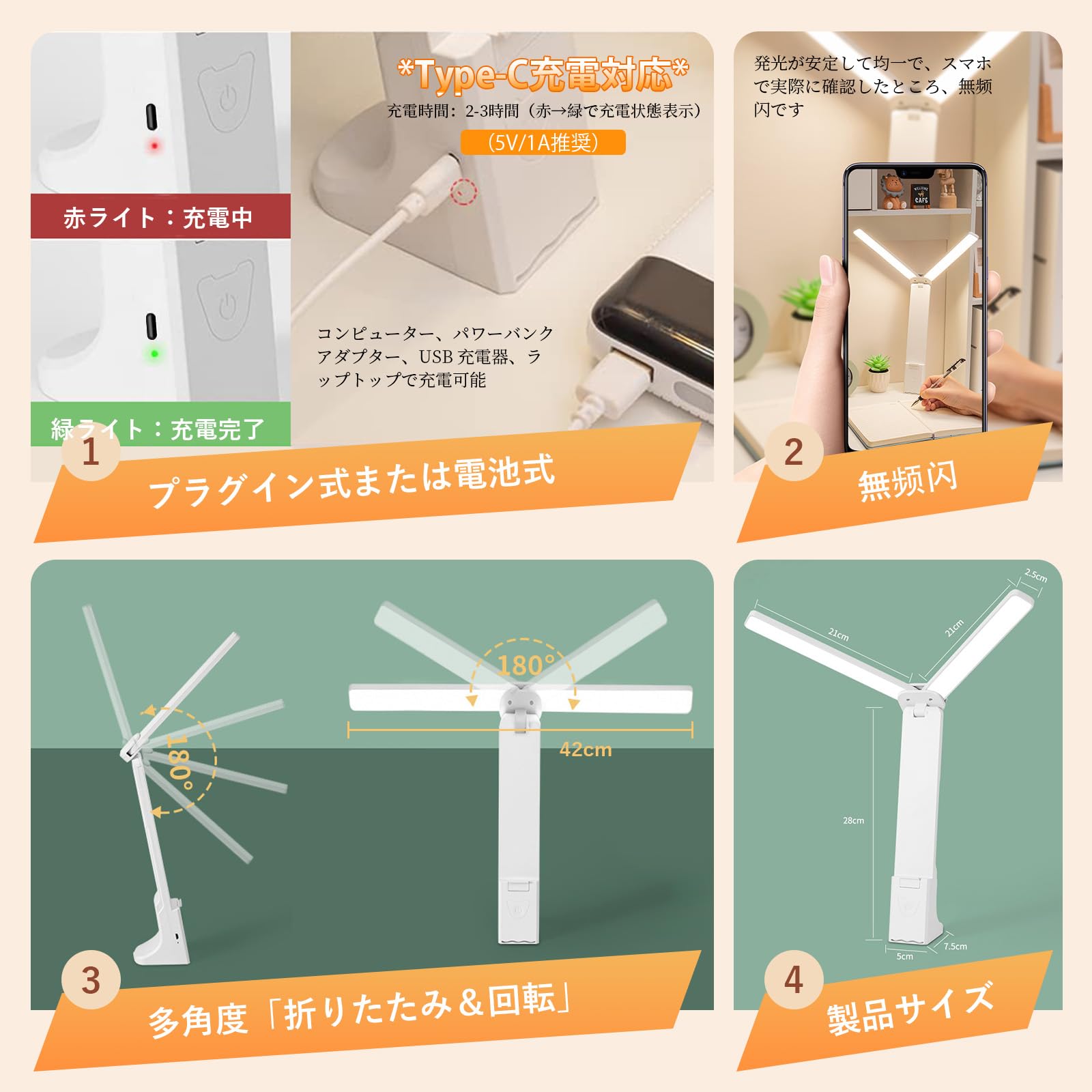 LEDデスクライト 充電式 4000mAh大容量 折り畳み式 3段階調色+無段階調光 コンパクト卓上ライト コードレス 読書ライト 多角度調整 メモリー機能 非常灯 寝室/仕事/勉強/旅行対応 携帯便利 ホワイト