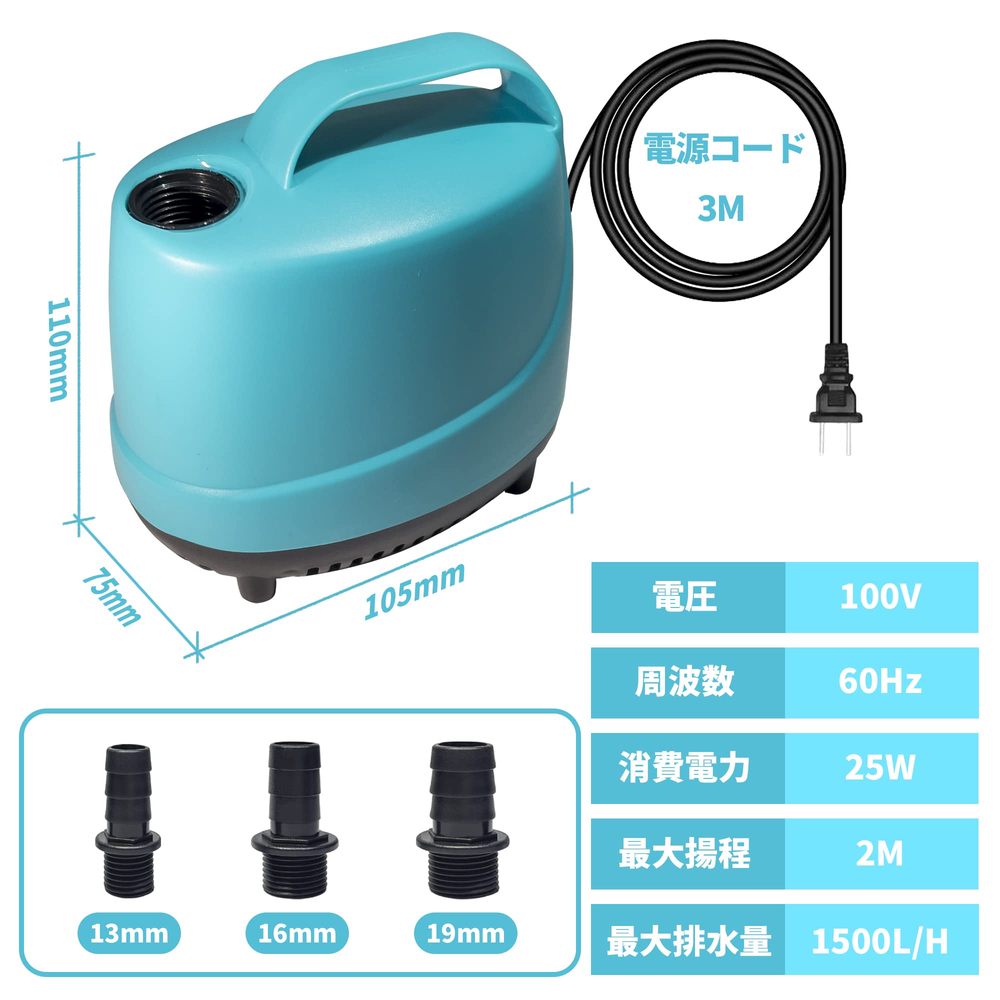 水中ポンプ 小型 循環ポンプ 25W 排水量1500L/H 最大揚程2M 電源コード3M 電動 静音 海水対応 排水ポンプ 給水ポンプ 水槽 水族館 お風呂の水 汚水 日本語取扱説明書