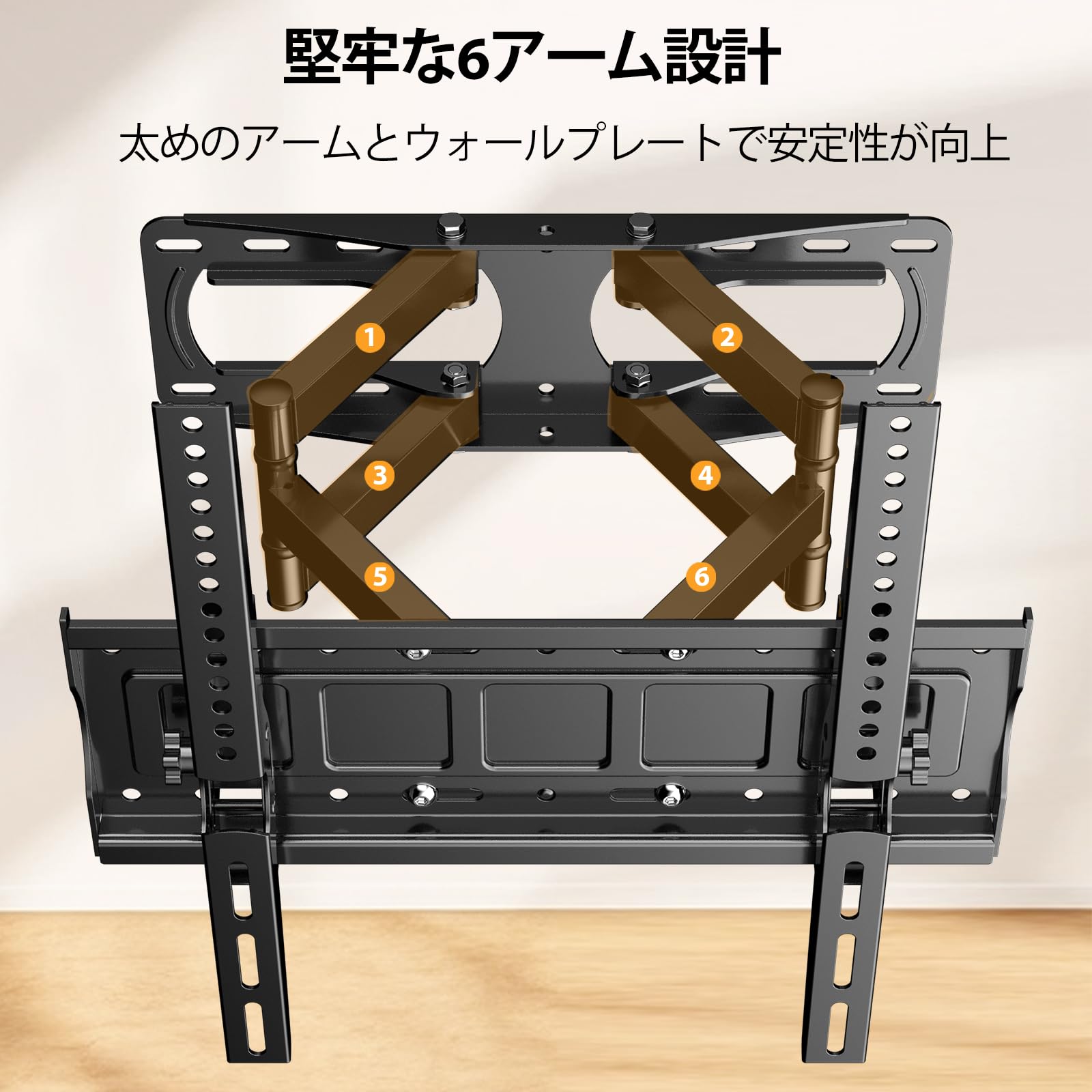 安定感があり耐震性にも優れる:SHTUMECテレビ壁掛け金具は、高品質冷間圧延鉄素材で作られて、強力なデュアル 6 アーム設計でテレビを壁に安全に固定し、ニーズに合わせて調整できます。 安全ロック・滑り止め・落下防止設計など安定感を高める配慮もあります。65インチの大型テレビでも安全に支えます。