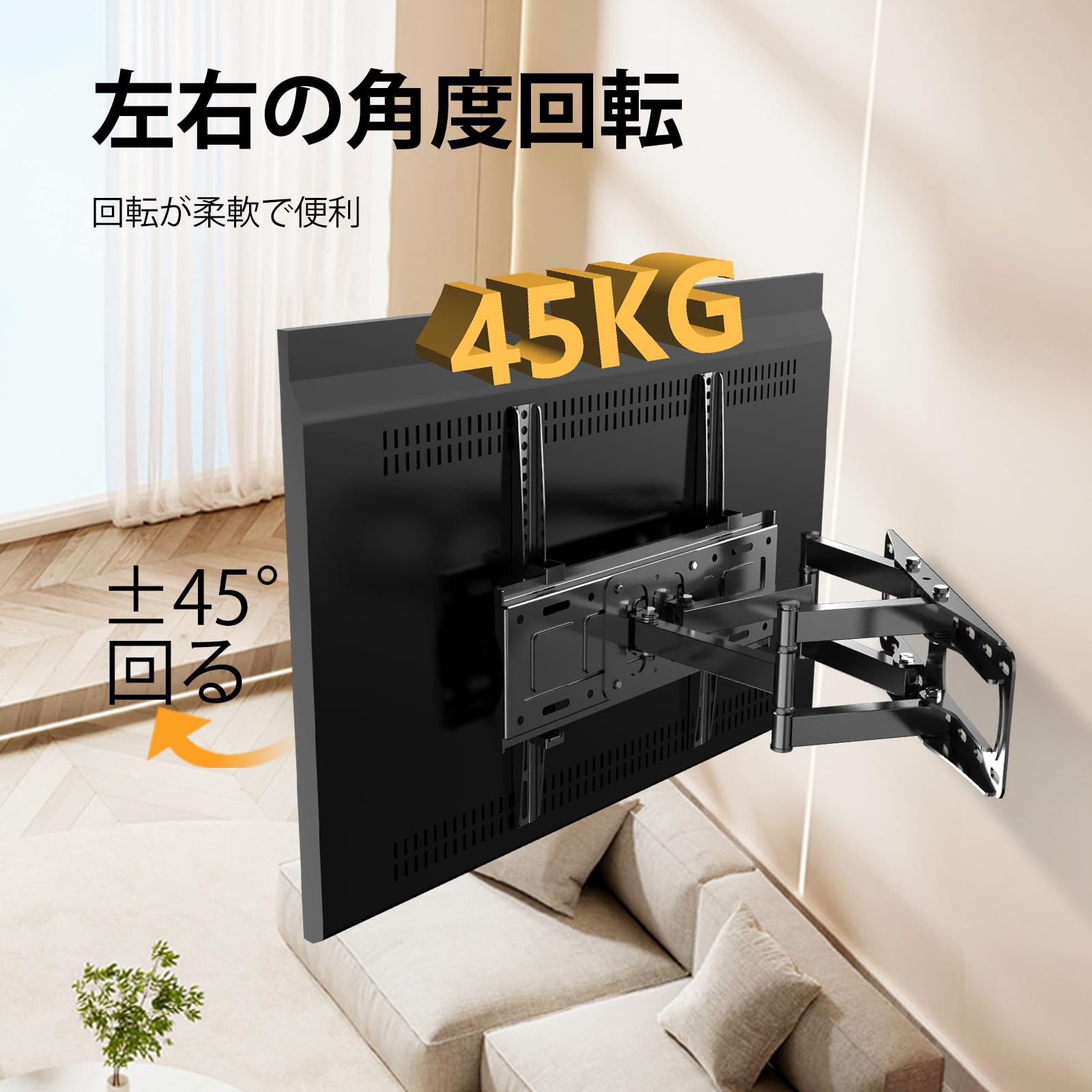 【角度が自由で見やすい】 tv壁掛け金具を取り付けた後、左右±45°、上向き15°、下向き15°角度の調節が対応しています。視聴位置に応じて好きな角度に設定可能です。さまざまな場所からテレビを見たい方にお勧めします