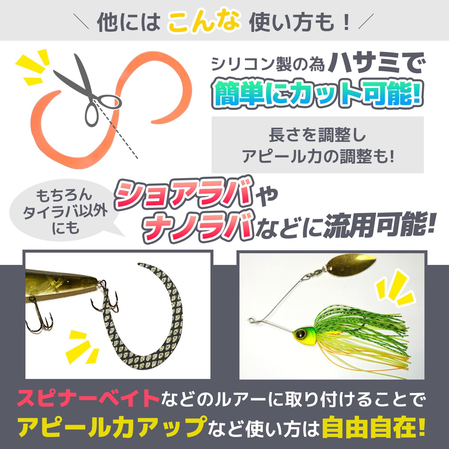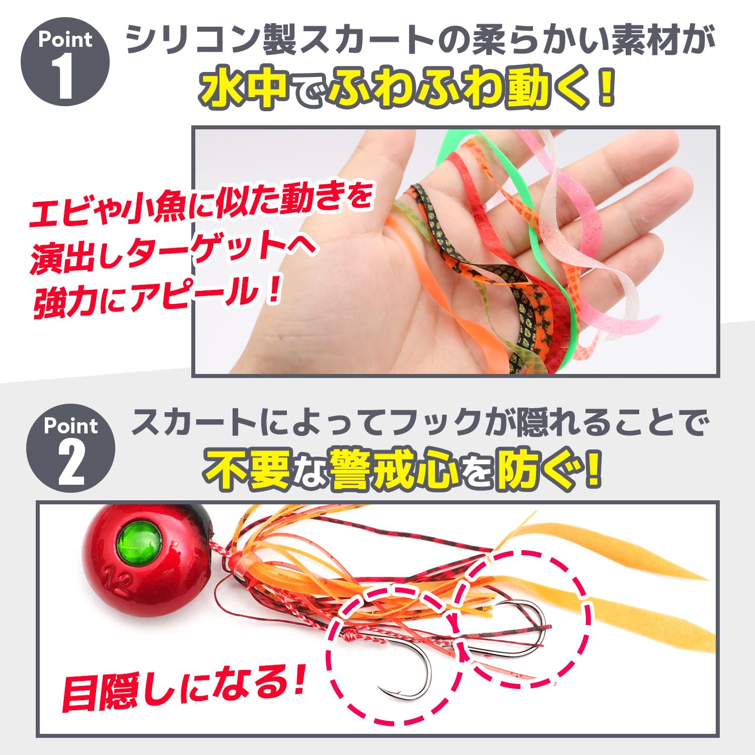 【シリコン素材】耐久性抜群のシリコン素材を採用!水中でひらひら動くスカートが自然なエサの動きとマッチ!警戒心の強い鯛を強力に誘います!シリコン素材の為ハサミで簡単に長さ調整も可能です!