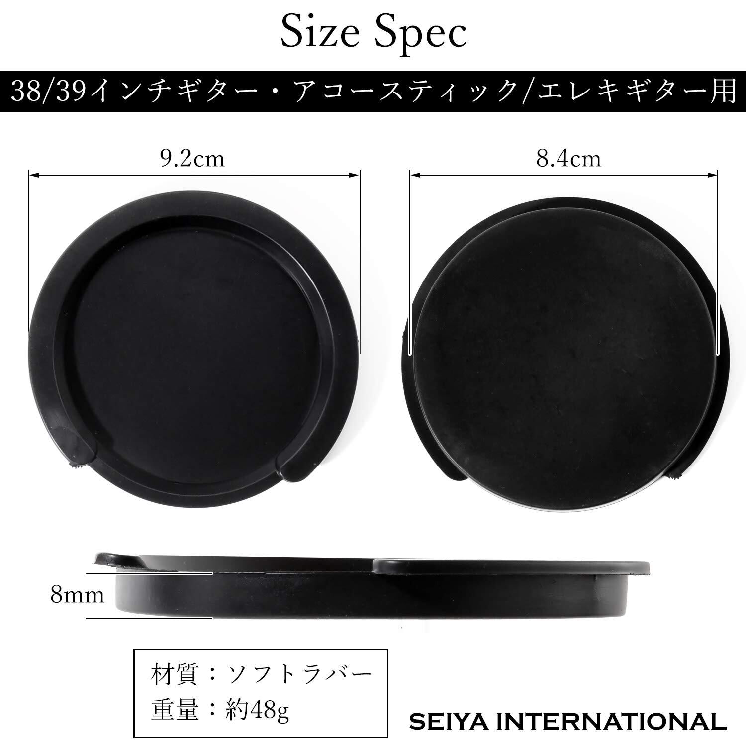 ?【 サイズ 】一般的な 38/ 39 インチギター・アコースティックギター エレキ クラシックギター用 直径:外側9.2cm 内側8.4cm 高さ:8mm 重量:約48g カラー:ブラック 材質:ソフトラバー 取り付けるギターによってはサイズが合わない場合がございます。ご購入前に取り付けるギターのサウンドホールのサイズを事前にご確認ください。