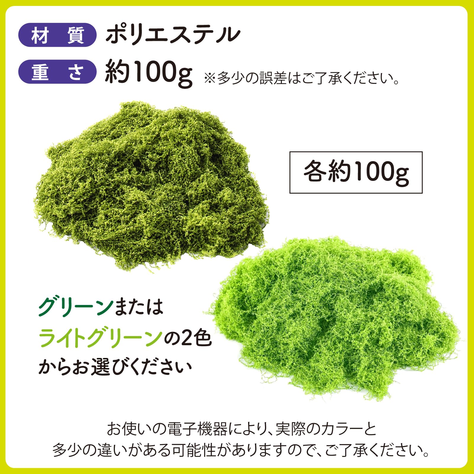 やわらかいフワフワした質感の、人工苔、フェイクモスです。100gワンセットでのお届けになります。ご使用になる量を、ハサミ等でカットしてご使用ください。