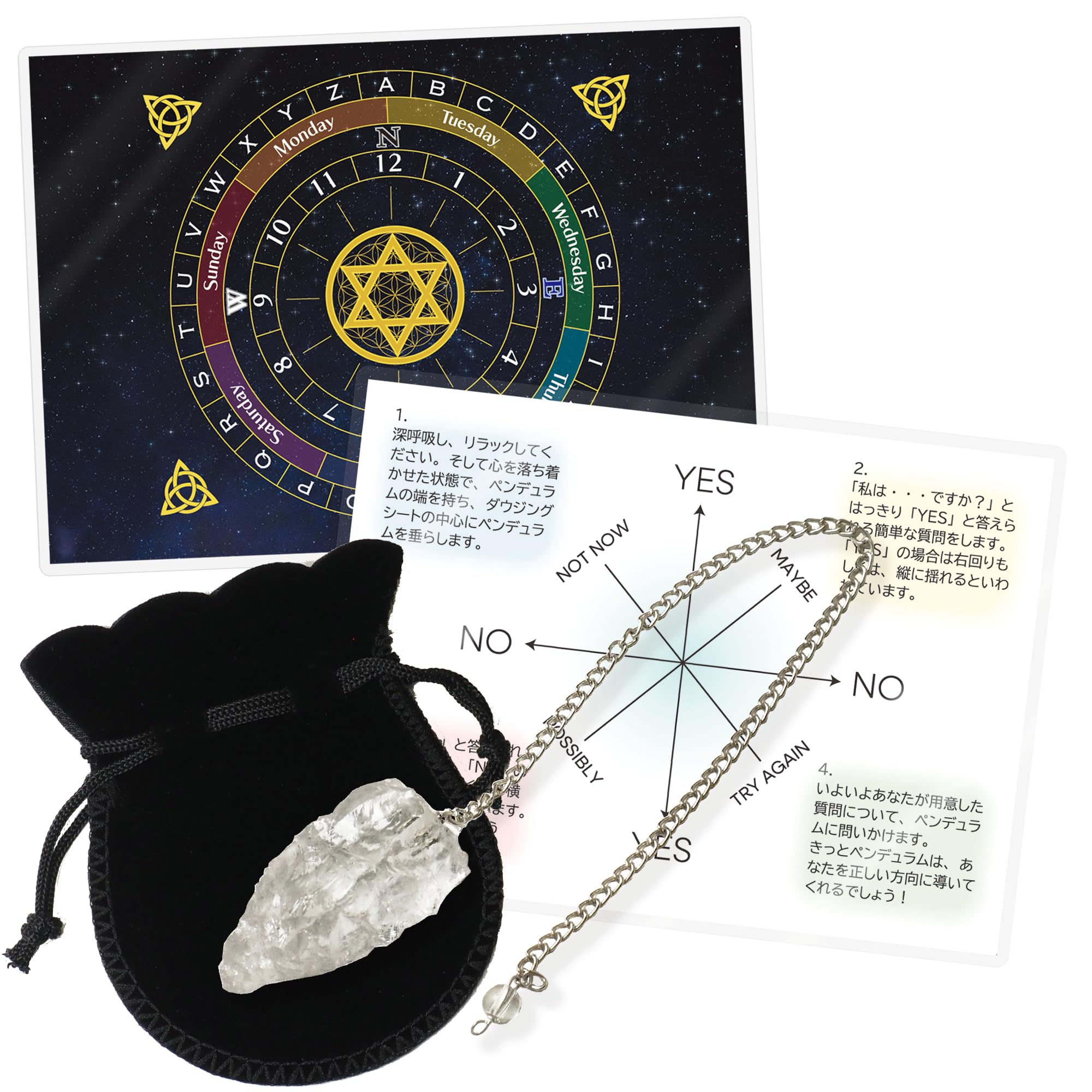 ?【用途】ペンデュラムはダウンジングに使われる振り子の事で、恋愛占いなどから色々な占いに使われている最も簡単な占いツールの一つです。また、付属のペンデュラムチャートで届いたその日から占いを始めることができ、初心者の方でも占いを始めやすいセットになっております。
