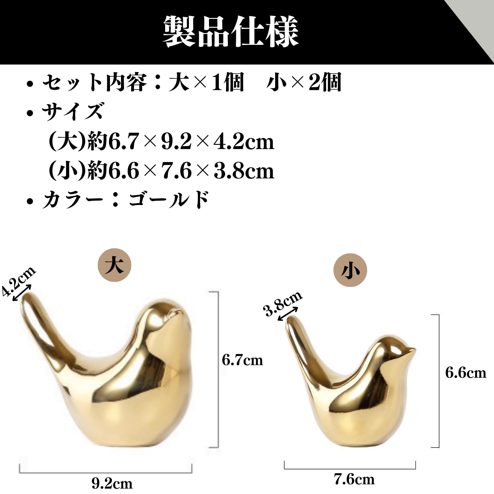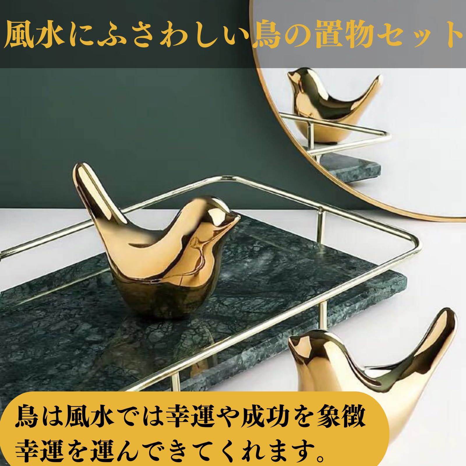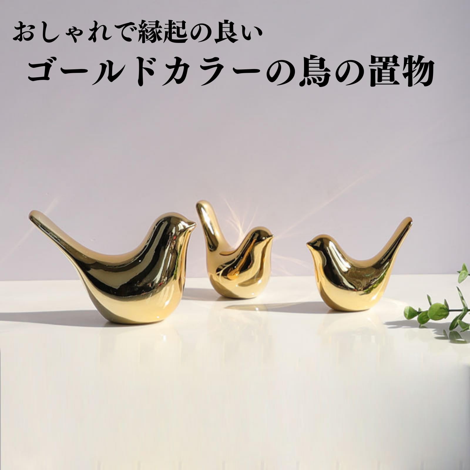 おしゃれで縁起の良いゴールドカラーの鳥の置物3個セット。シンプルなデザインなのでどんな場所にも合わせやすいです。風水で鳥の置物は縁起が良いとされ、緑や幸運を運んでくれるとされています。