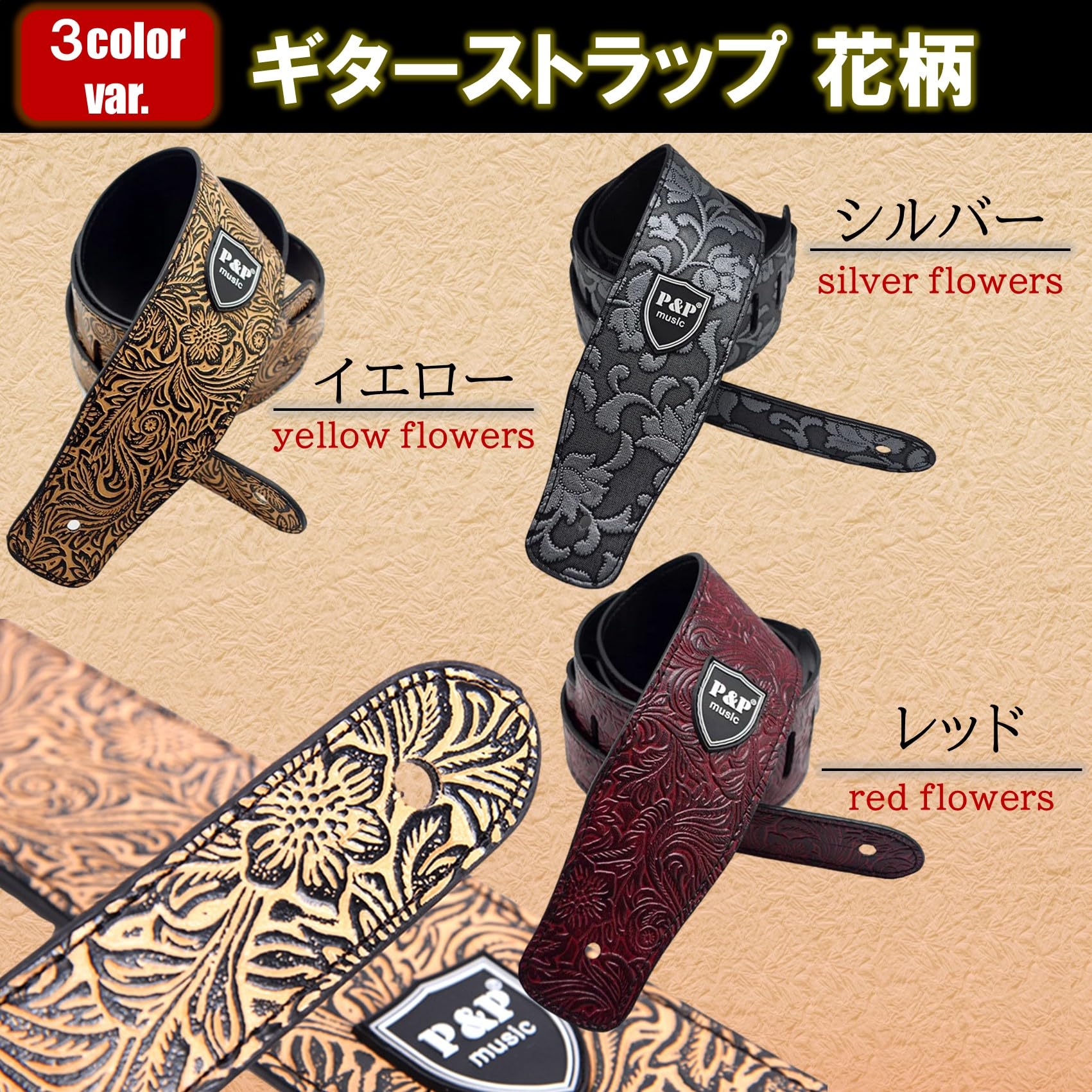 商品詳細:ギターストラップ花柄 【カラー】 イエロー/シルバー/レッド 【材質】 PUレザー 【長さ】 約127-150㎝(調整可) 【幅】 約6.5cm 3cm 【加工】 エンボス加工(型押し)
