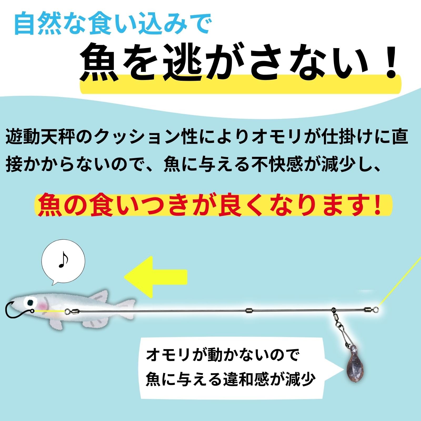 遊動天秤のクッション性によりオモリが仕掛けに直接かからず、魚に与える不快感が減少し、魚の食いつきが良くなります。