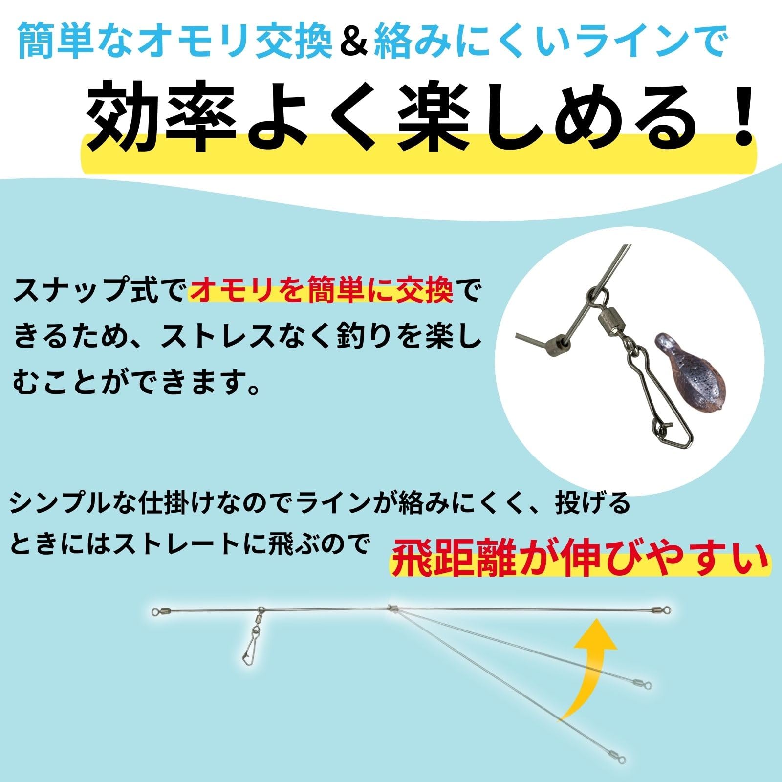 スナップ式でオモリを簡単に交換できます。シンプルな仕掛けなのでラインが絡みにくく、投げるときにはストレートに飛ぶので飛距離が伸びやすいです。