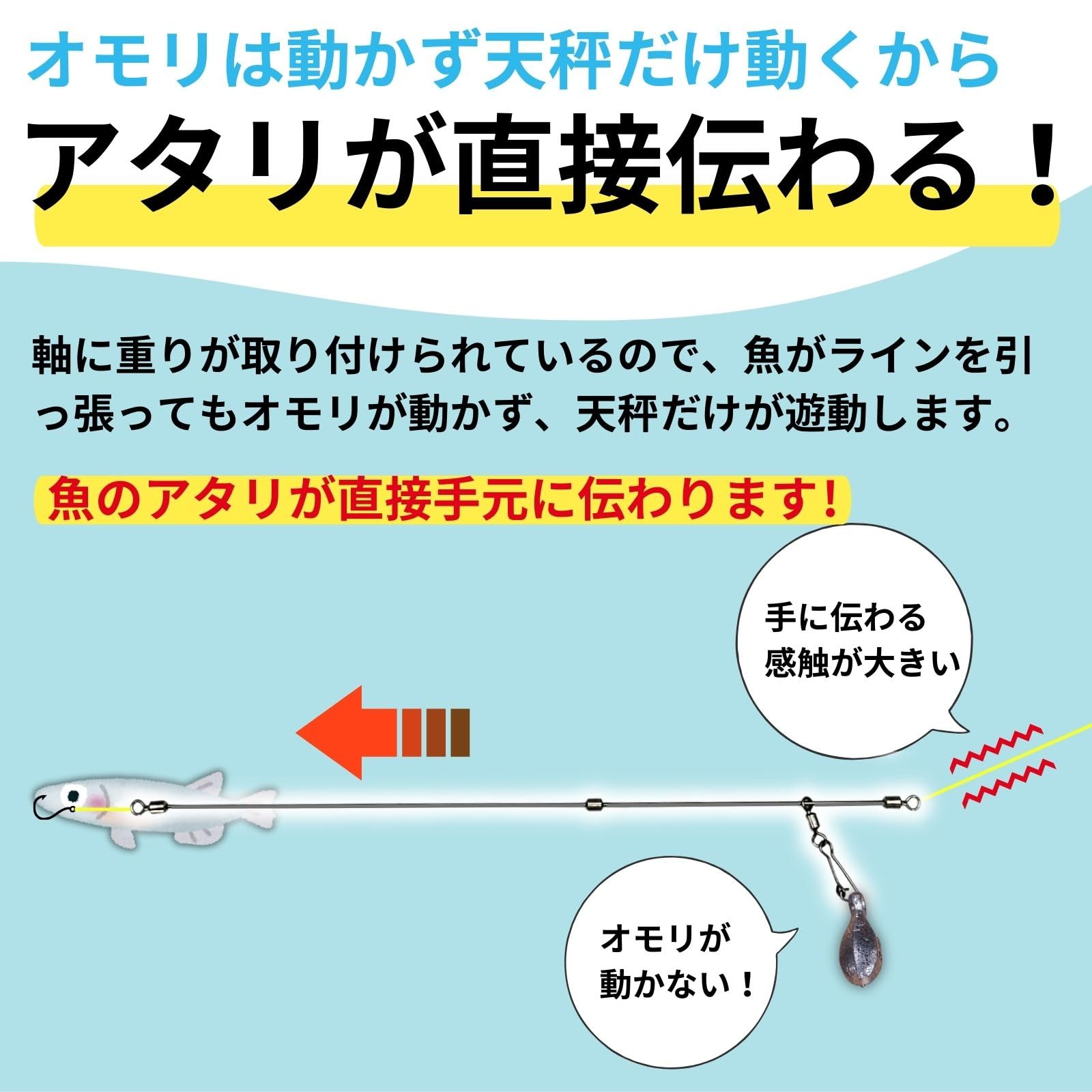 遊動天秤は、軸におもりが取り付けられており、魚がラインを引っ張ってもおもりが動かず、天秤だけが遊動します。これにより、魚のアタリが直接手元に伝わり、アタリを感じ取りやすくなります。