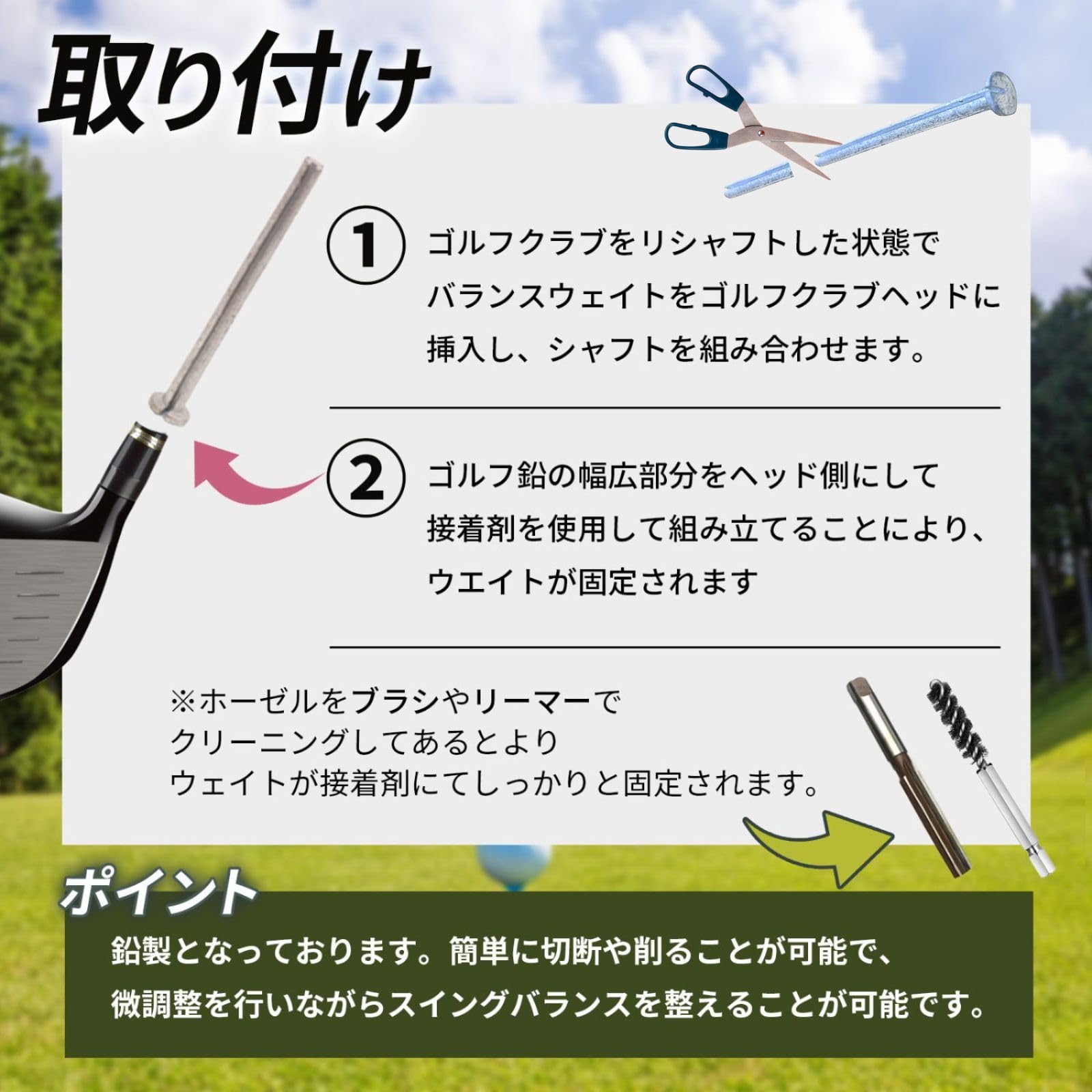 【8g単位で細かく調整】 1本あたり約8g。必要に応じて本数を変えたり、ハサミやカッターで簡単にカットできるため、鉛テープや鉛シートよりも安定した重量調整が可能。シャフト内に挿入する棒状ウェイトだからズレにくく安心です。