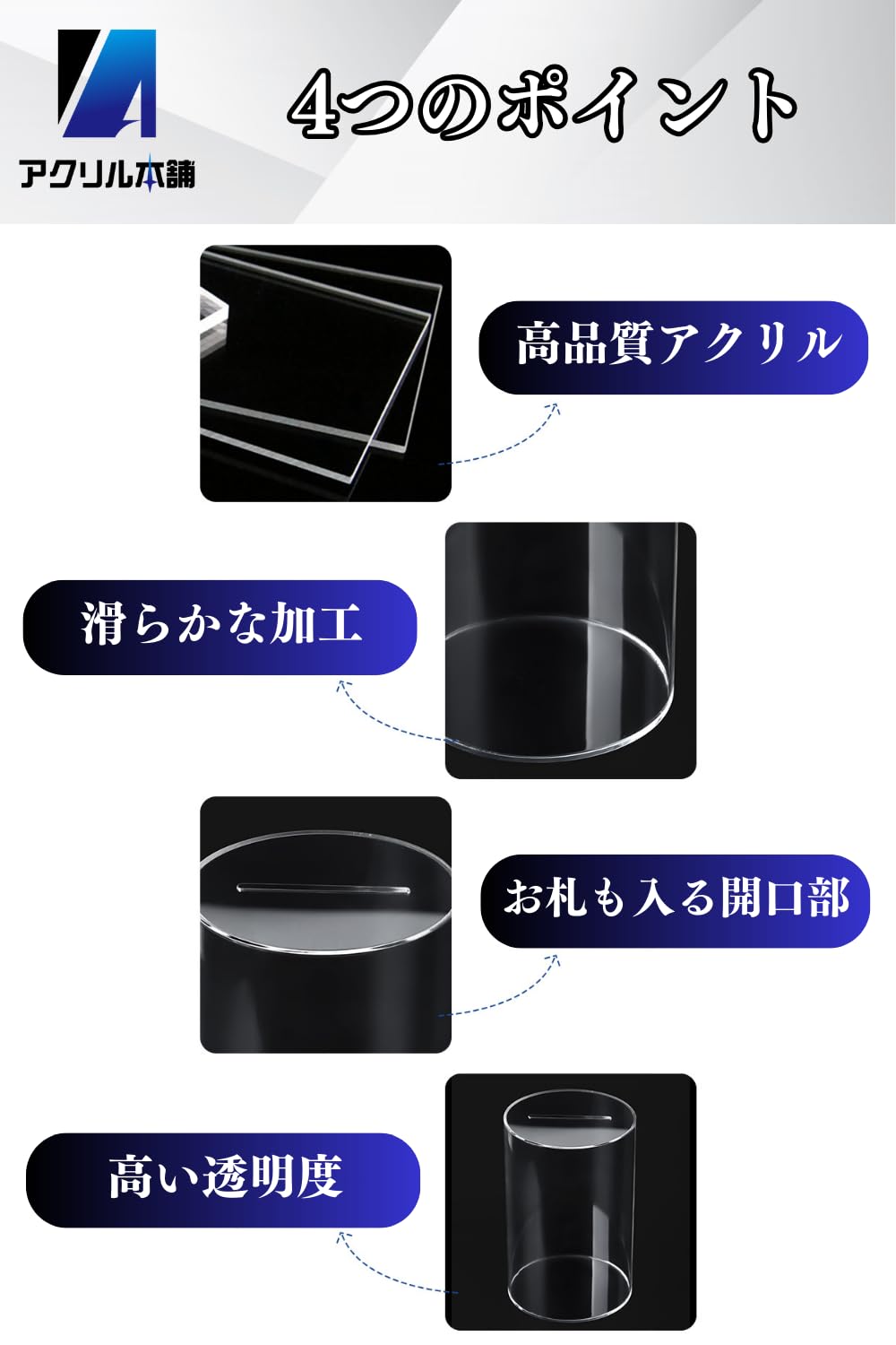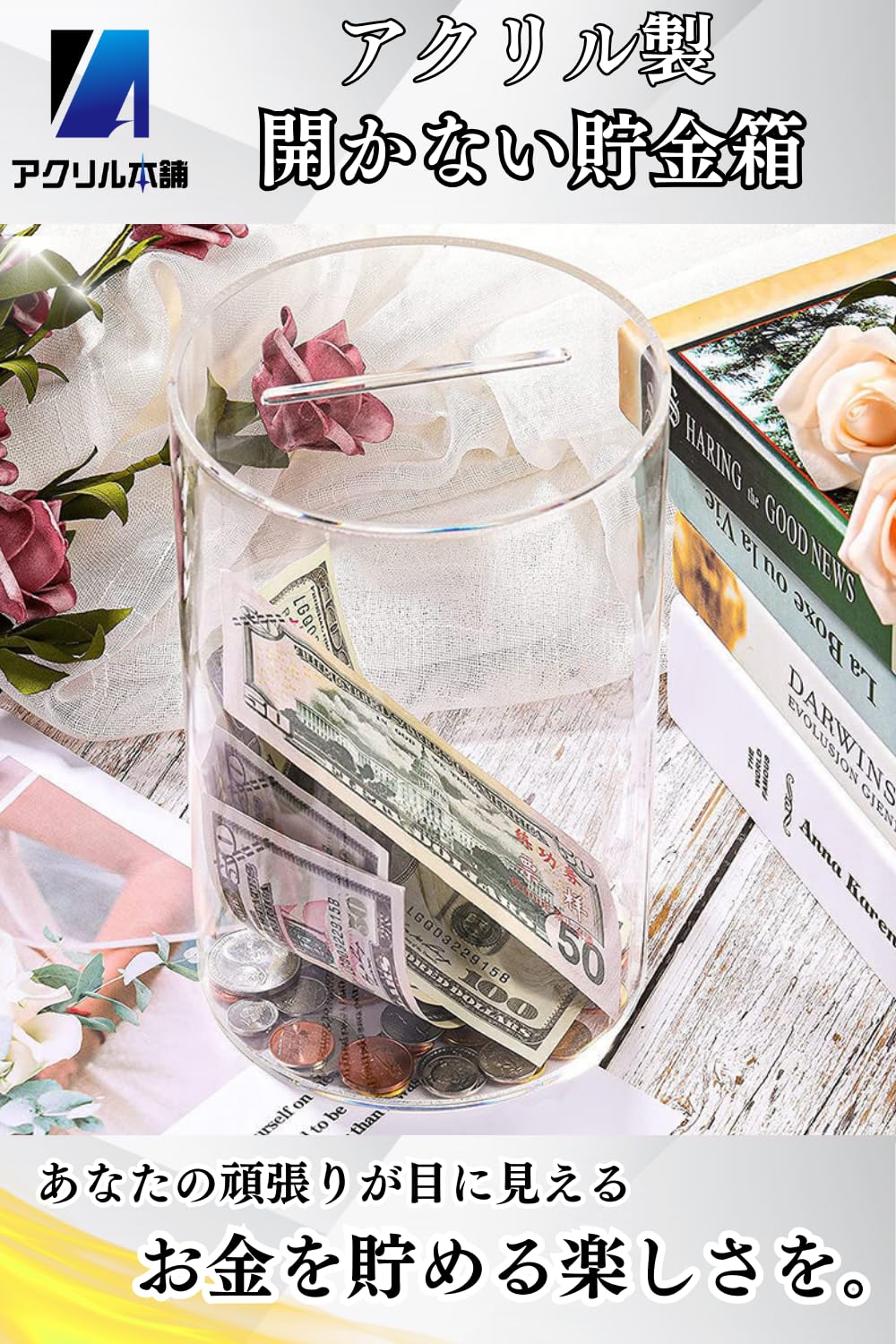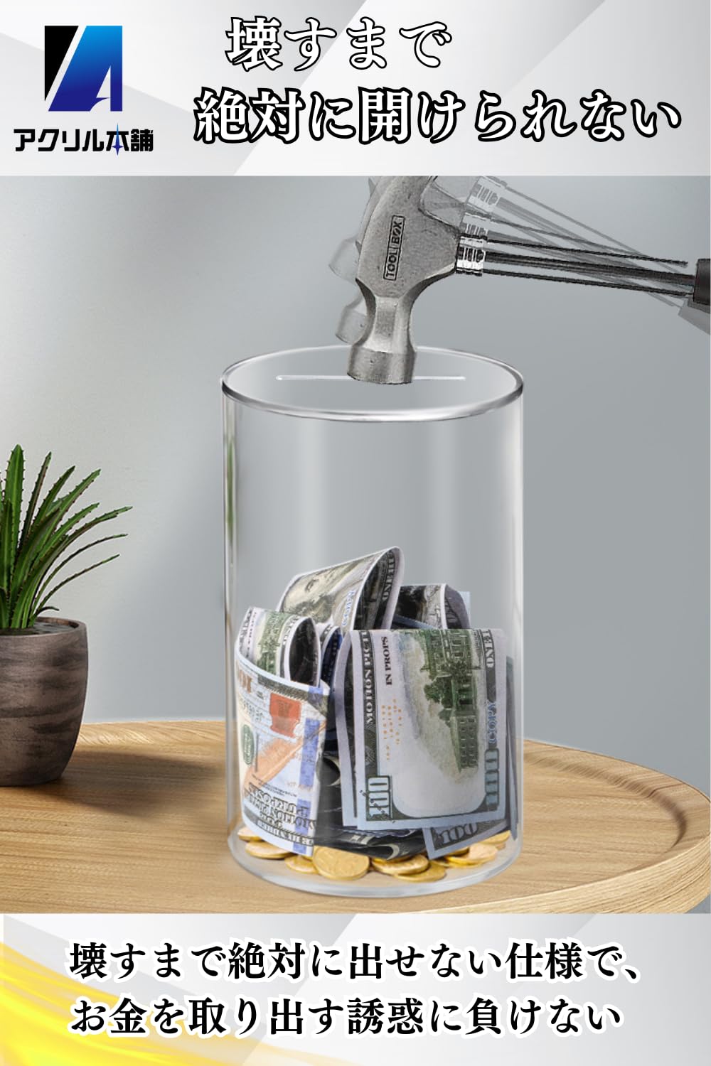 【開封まで絶対にお金を取り出せない貯金箱】取り出し口がなく、貯金箱本体を壊さない限り、お金を引き出すことはできません。この設計は、「途中でお金を取り出す誘惑に負けない」「貯金できない」という方にぴったりのお札貯金箱です。【高品質なアクリル製】低品質なプラスチックや壊れやすいセラミックス、開けにくいステンレス鋼と比較して、アクリル本舗の貯金箱は頑丈で安全で、厚くて壊れにくいアクリル材料で作られています。たくさんの貯金が可能で、長期的な貯金に最適です。【クリアで中身が見える】透明でデザイン性が高いため、中身が見えることで貯金のモチベーションが高まります。貯まっていく楽しさを感じることができます。【プレゼントとしても】あらゆる年齢の男の子や女の子に最適な贈り物です。誕生日やクリスマス、新年に最適です。子供用の貯金箱は、お金を節約する際に蓄積を明確に観察し、貯蓄習慣や自己管理能力を身につけるのに役立ちます。【硬貨・紙幣どちらにも対応】紙幣は折らずにそのまま収納できるため、綺麗な状態で保管可能です。シンプルでお部屋の雰囲気を損ねない筒型貯金箱です。【安心の日本ブランド】商品は当店オリジナルブランド「アクリル本舗」のブランドパッケージに入れてお届けいたします。当ブランドの商品はご購入後30日間は返品・にて対応させていただきます。