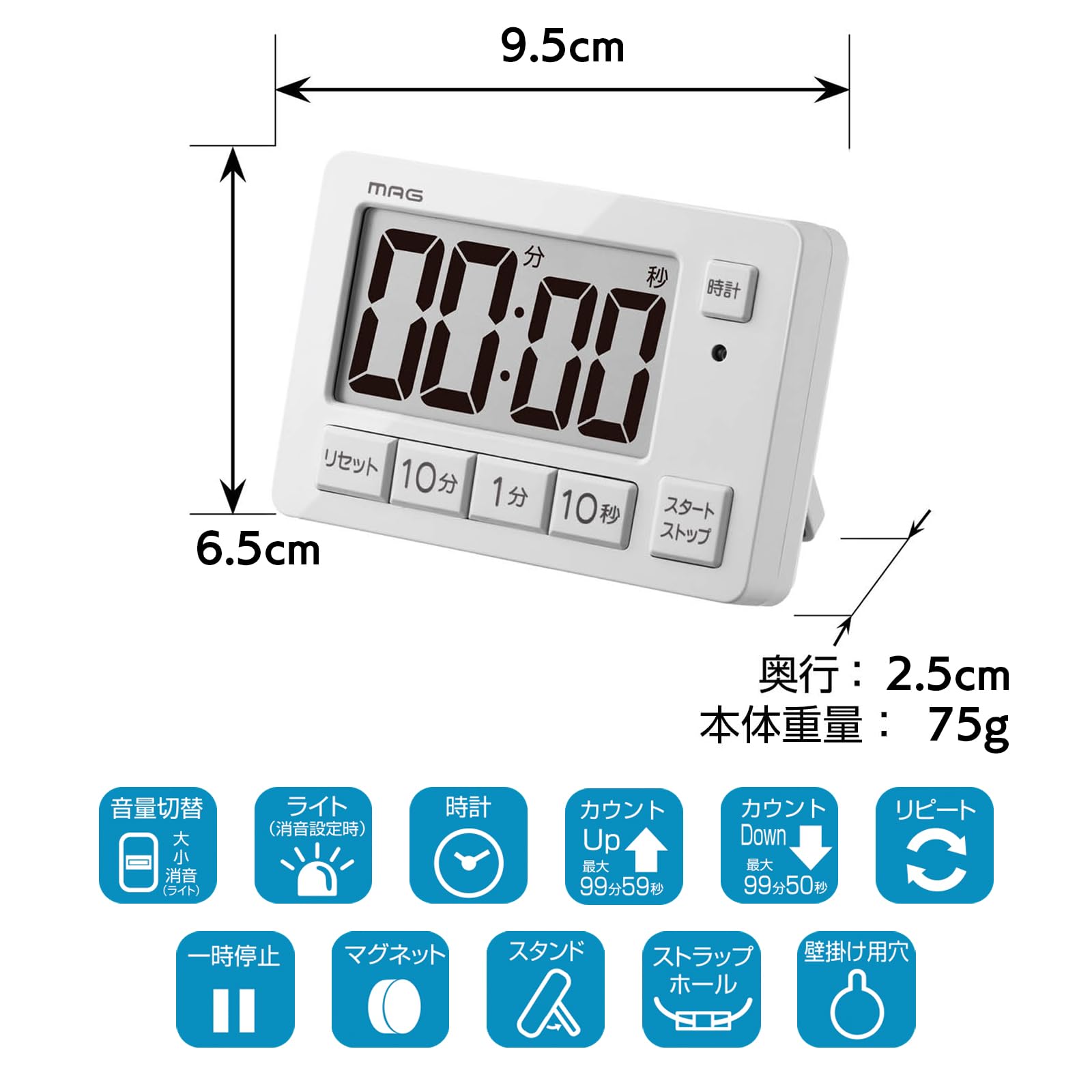 機能:カウントダウン(最大99分50秒)、カウントアップ(最大99分59秒)、リピート機能、一時停止機能、アラーム音量切替(大・小・消音(ライトが点滅))、時刻表示、12/24時間表示切替、本体裏マグネット付き、ストラップホール、置き掛け兼用(自立スタンド内蔵)