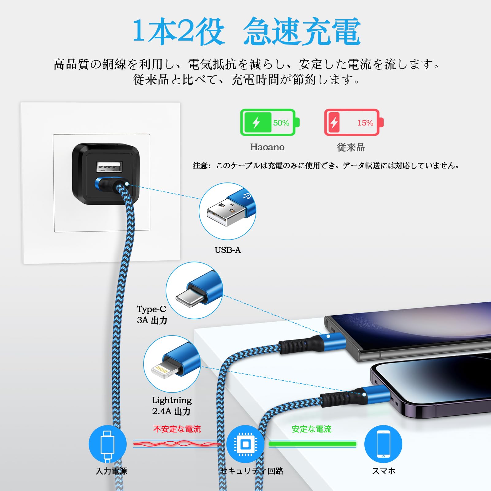 【2台同時充電】2in1 usb ケーブルは銅製心線を採用し、電気抵抗が低く、 充電速度がより速くなり、充電時間も短縮してくれて、2台のデバイスを同時に充電可能です。Type-Cポートは最大3Aの電流をサポートし、Lightningポートは最大2.4Aの電流をサポートします。(ご注意:2イン1 充電ケーブルは充電のみで、データ転送には対応しておりあせん。)