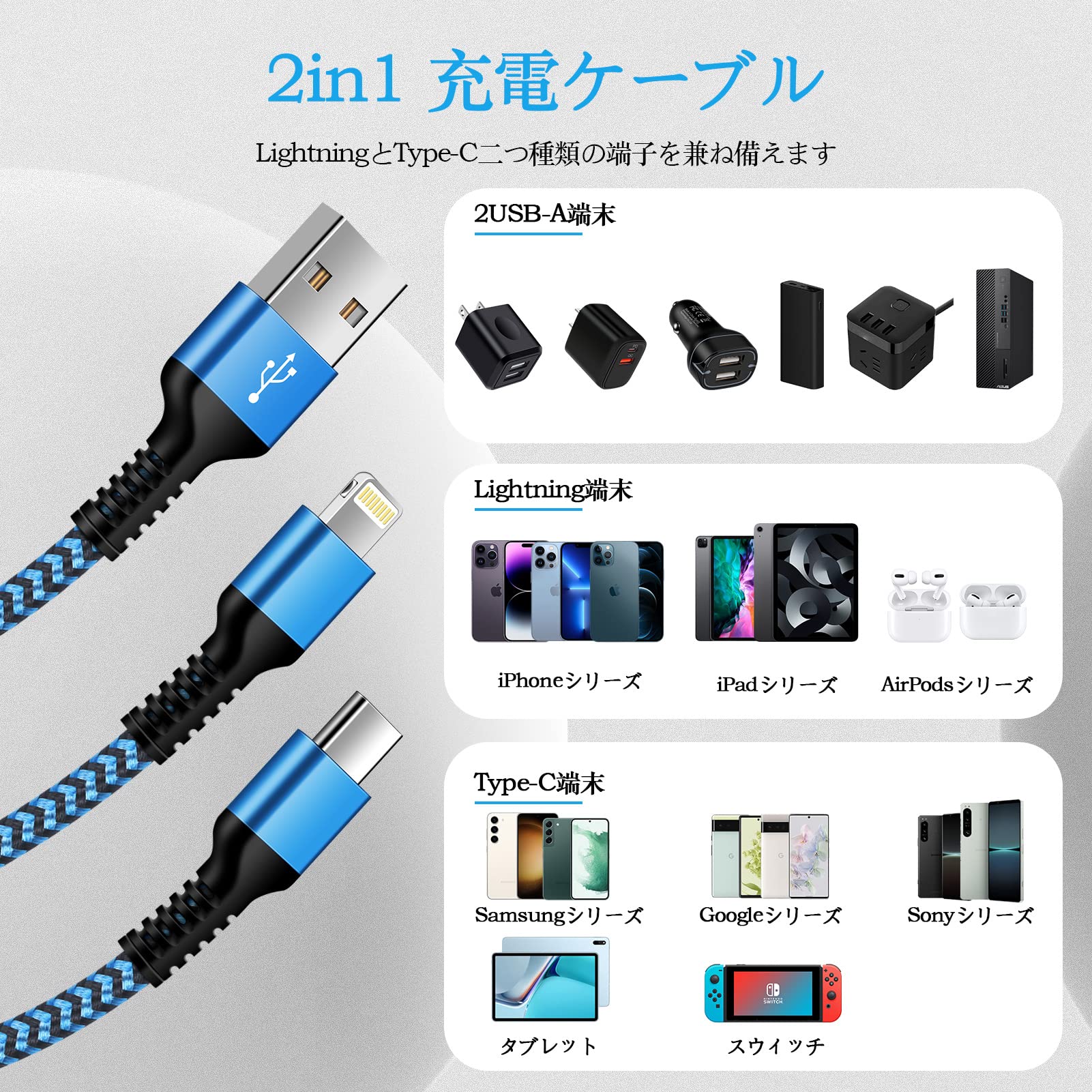 【1本2役】本製品はType-Cとライトニング接続端子を1本の高品質なケーブルにまとめまして、2台のデバイスが同時に急速充電できます。家族、旅行、仕事、出張、さらには車の後部座席でも電子デバイスを充電するのに最適です。(ご注意:製造時期によりケーブル接続部のカラーに若干の違いがある場合がございます。予めご了承の上お買い求めください。)