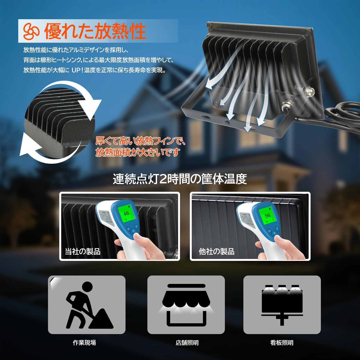 【放熱性能に優れ、長寿命】熱は LED 投光器の寿命を短くする主な原因です。LED 投光器が速やかに放熱できない場合、その寿命は短くなります。当社の LED 投光器は放熱性能に優れたアルミニウムを採用し、本体の厚さは 4cm(他社製品は通常 2.5〜3cm です)となっており、櫛形放熱構造に十分な放熱面積を確保しています。これにより、過熱による故障を防止し、寿命を効果的に延長することができます。