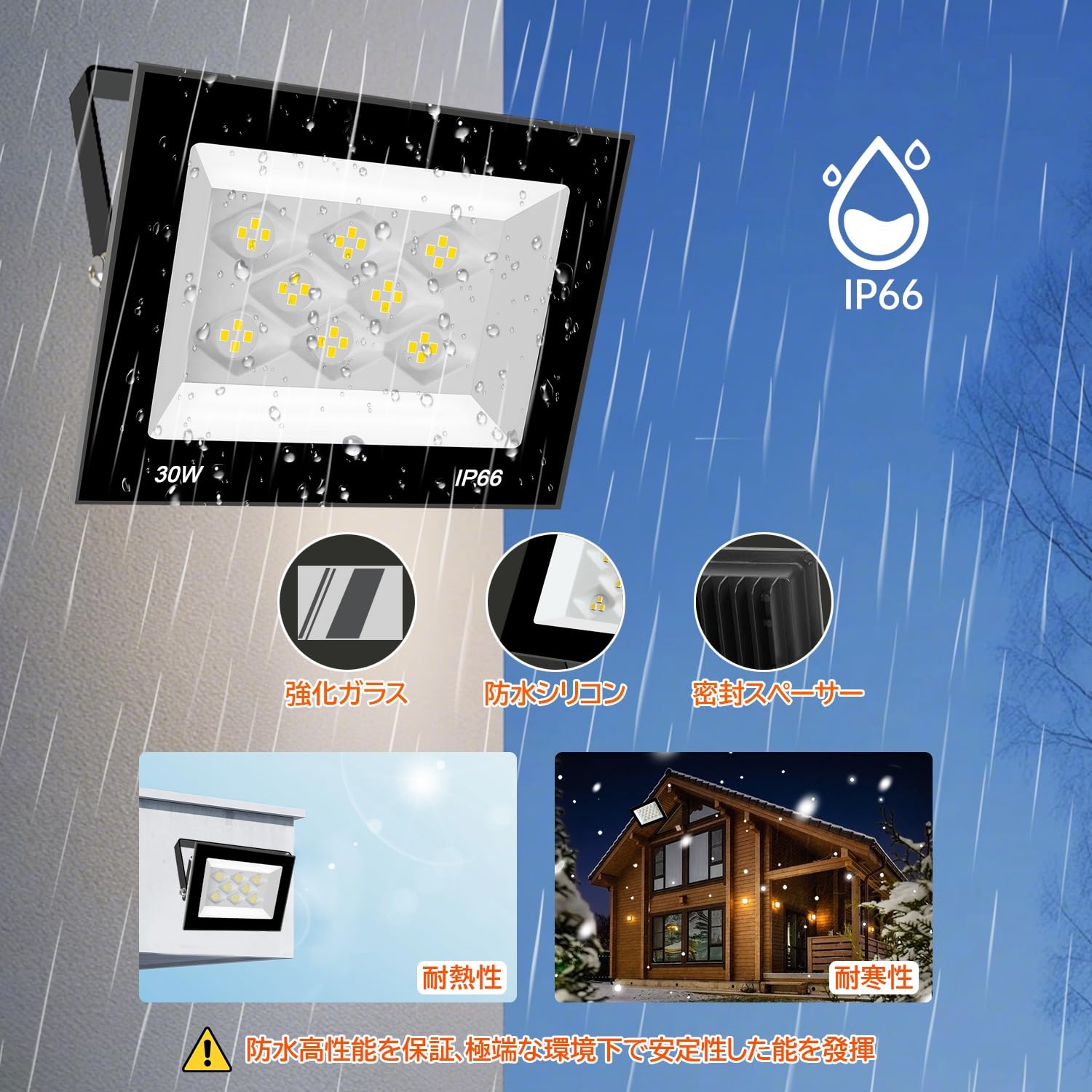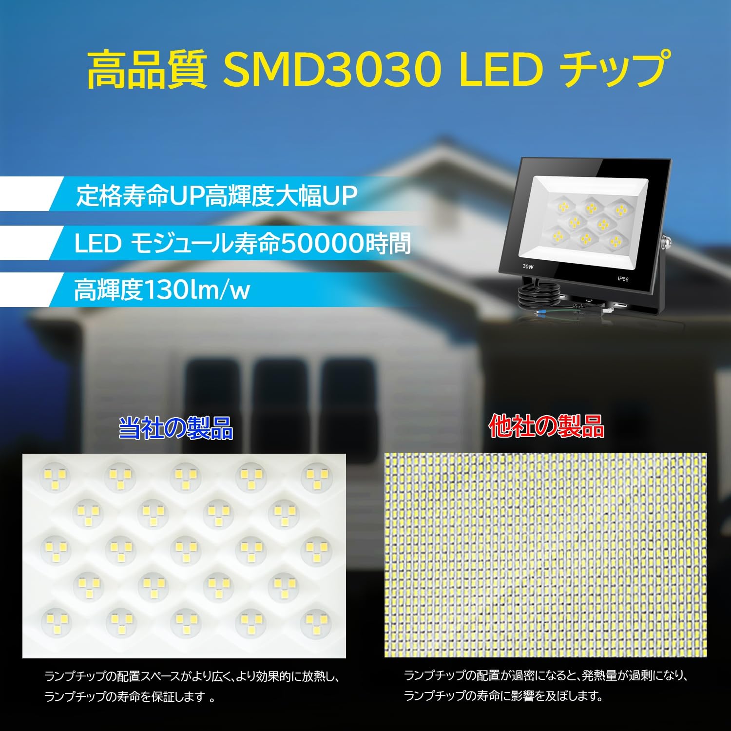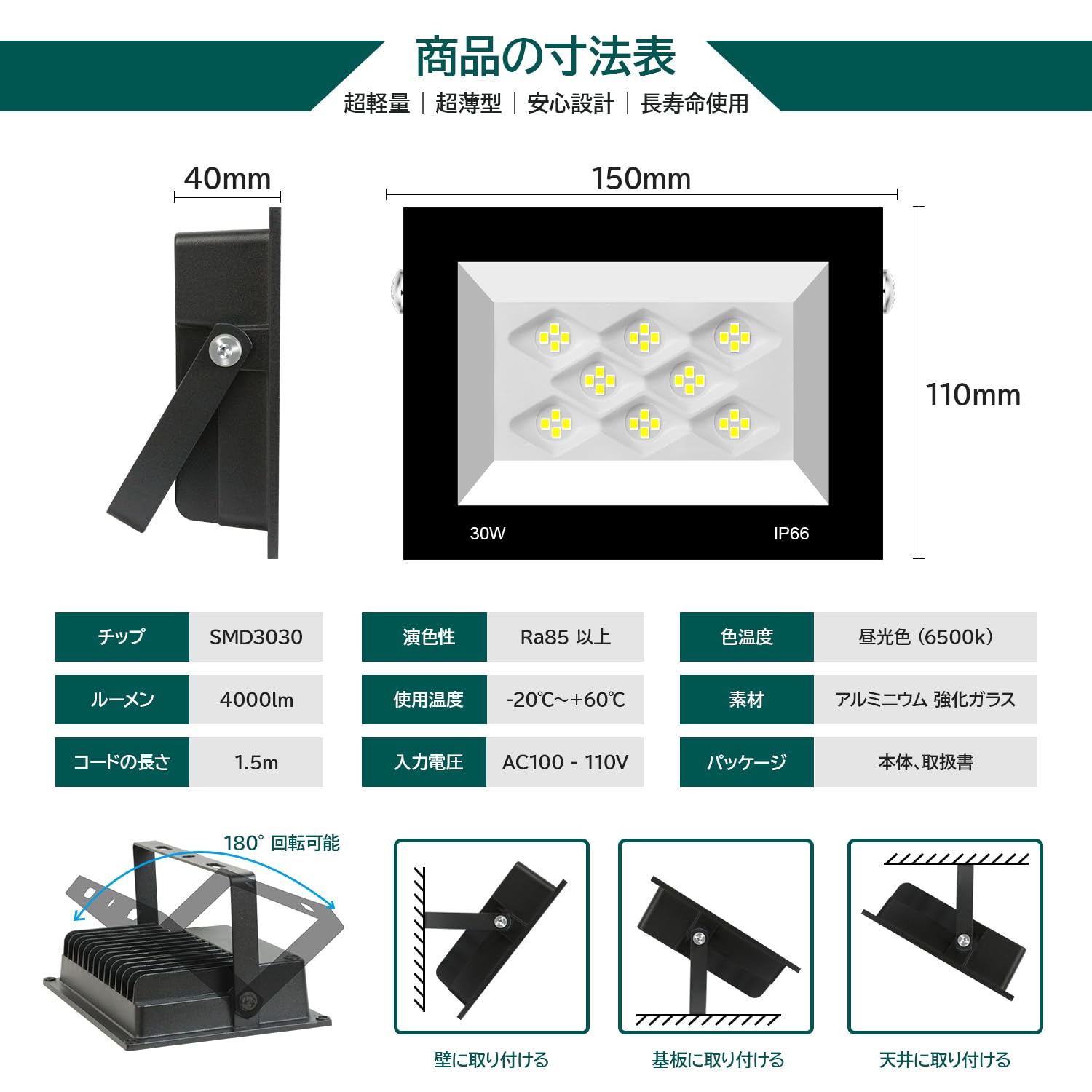 【主な仕様】:「30W LED投光器」;「色温:6500K(昼光色) 4000LM」;「ランプ本体の厚さは 4cm で、放熱効果と外観を両立しています」;「LED発光源:SMD3030」;「CRI >85」;「発光角度:120°」;「ケーブル:1.5m」;「入力電圧:AC 100-110V 50~60Hz」;「接地線付きプラグ」;「重さ:0.42kg 」;「防塵防水:IP66」; 「放熱設計:アルミ材質と櫛形ヒートシンク」;「リフレクターカップ:新型格子状ナノリフレクターカップ」。
