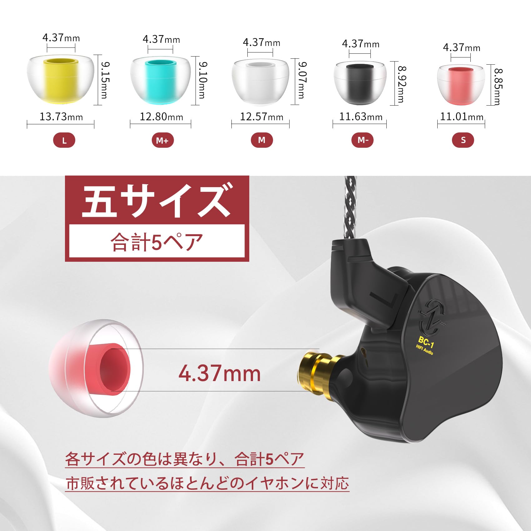 S、M-、M、M+、L色違い計5サイズのイヤーピースあり、イヤホンに合わせてお好みの色とサイズをお選びいただけます。