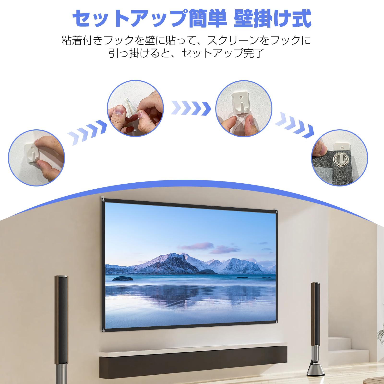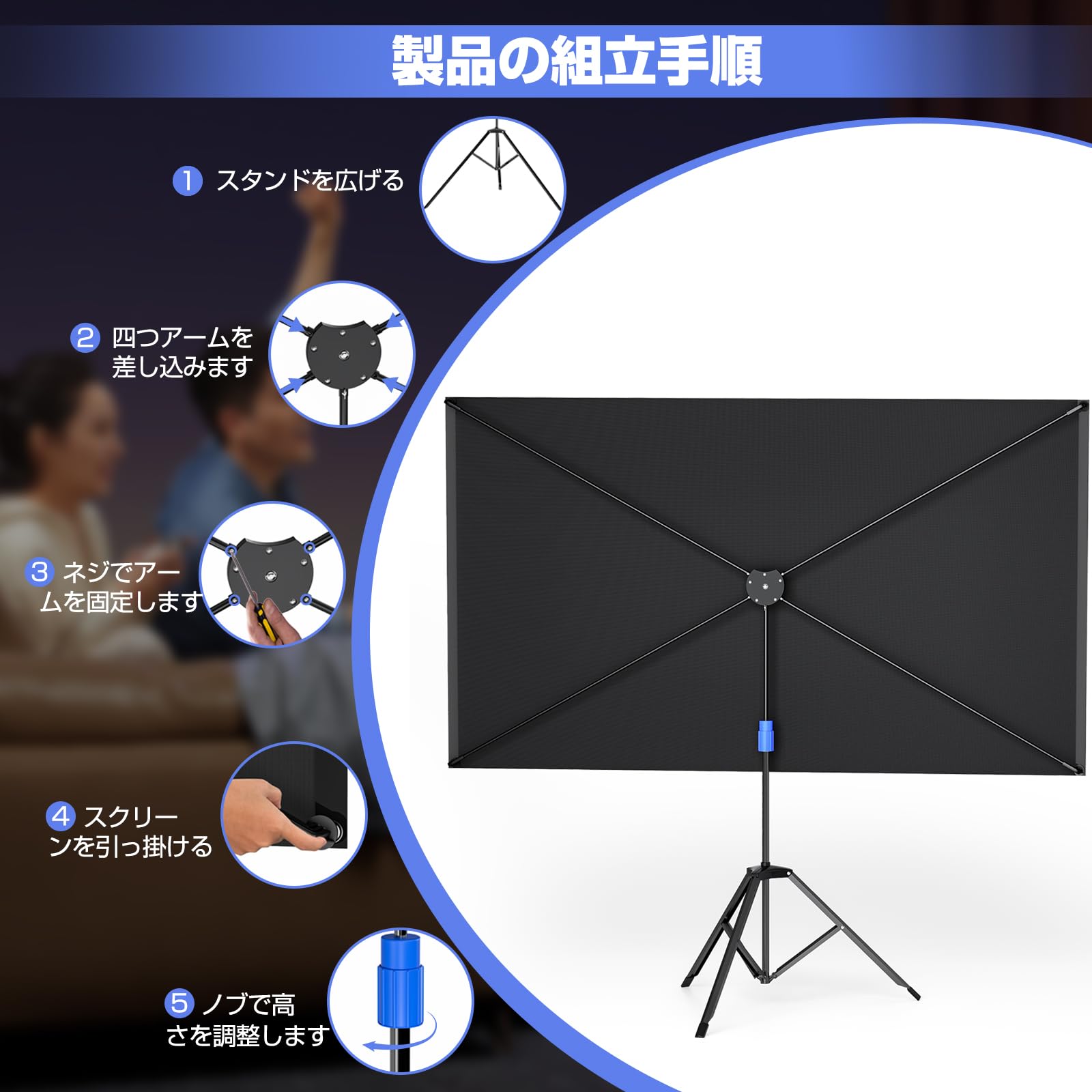 セットアップ簡単:組み立て画像を参考し、わずか数ステップで簡単に組み立てたり分解したりできます。女性一人でも、組み立てできる仕様です。そのプロジェクタースクリーンはご家庭、学校、オフィス、結婚式、ディスカッション、いろんな場面で活躍します。