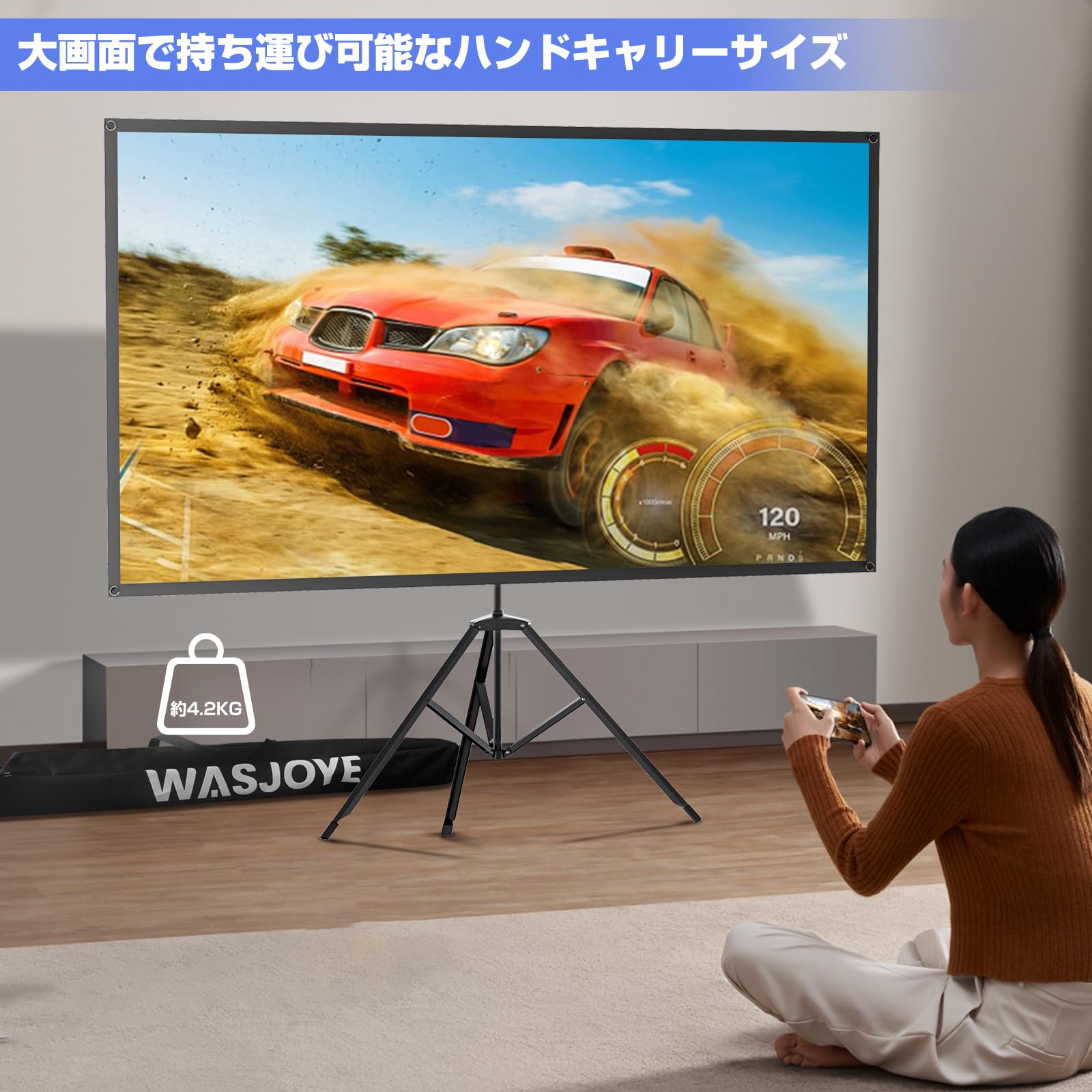 スクリーン 携帯式。スクリーンはコンパクトなサイズです。正味重量は約4.2kg、この三脚プロジェクタースクリーンは軽量化デザイン仕様です。キャリアバッグはプロジェクタースクリーンのすべての部品収納でき、どこにも簡単に持ち運びできます。