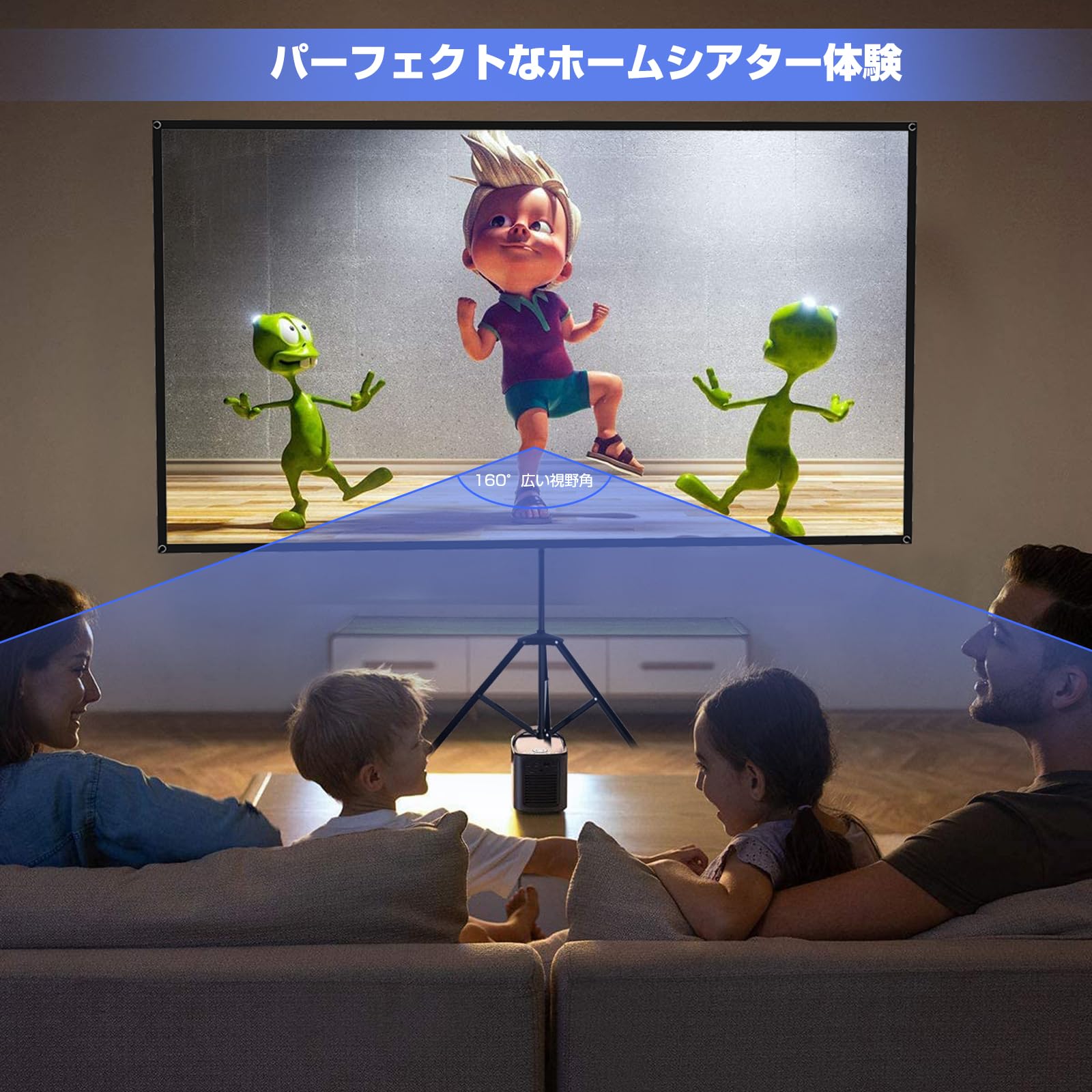 16:9の比率と160°の広視野角:16:9の映像は、デジタルテレビ、ミュージックビデオ、映画、アニメ/TVシリーズ/DVDビデオ、Youtubeビデオなどでよく使われる画面比率です。高い1.2のスクリーンゲインので、非常に画質のよい、ほかのスクリーンよりももっとはっきり明るい良いな視覚の体験を楽しむことができます。視野角160°のプロジェクションスクリーンは、家族や友人と一緒に映画を見るのに最適です。