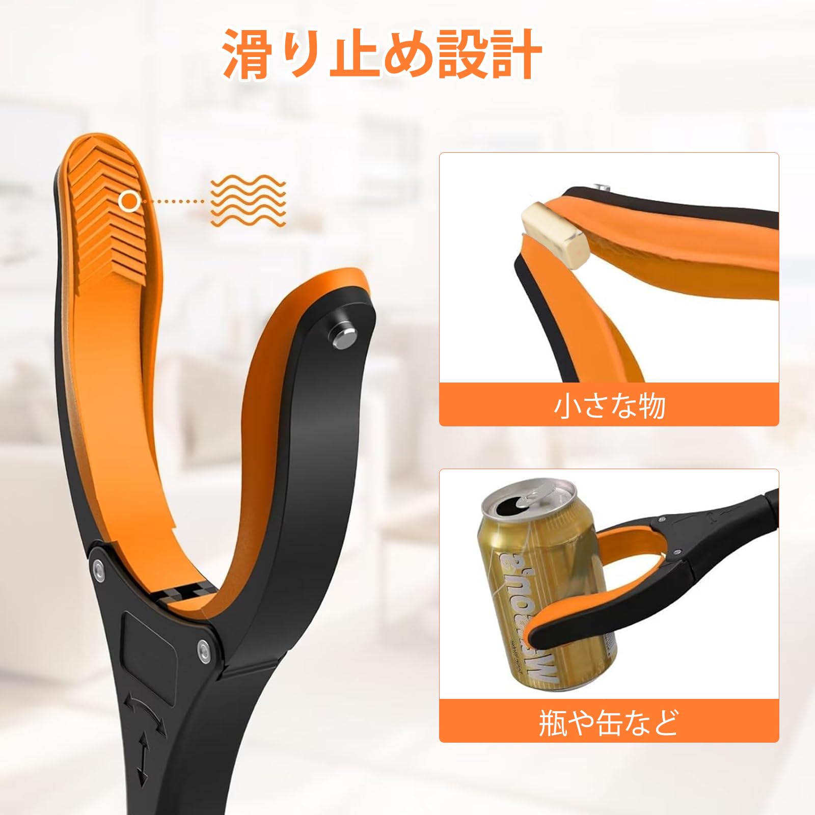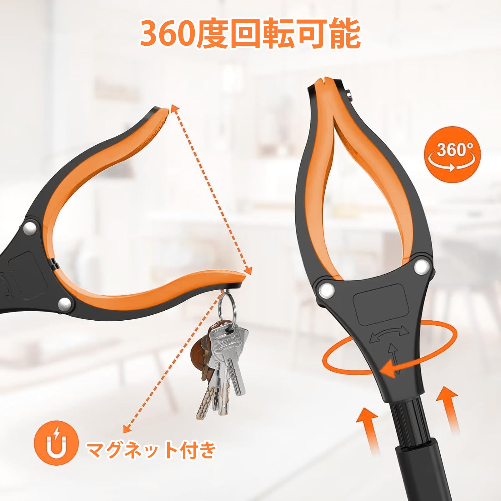 高所に適した拡張設計:人間工学に基づいたハンドルを設計しており、109 CMがあるので、手でグリップを軽く握るだけで、少し遠かったり高い所に置いてあった欲しい物や、狭い場所に落とした物をを素早く掴むことができます。挟む部分の先端は小さな磁石を内蔵して、鍵やその他の小さな金属物を拾うことができます