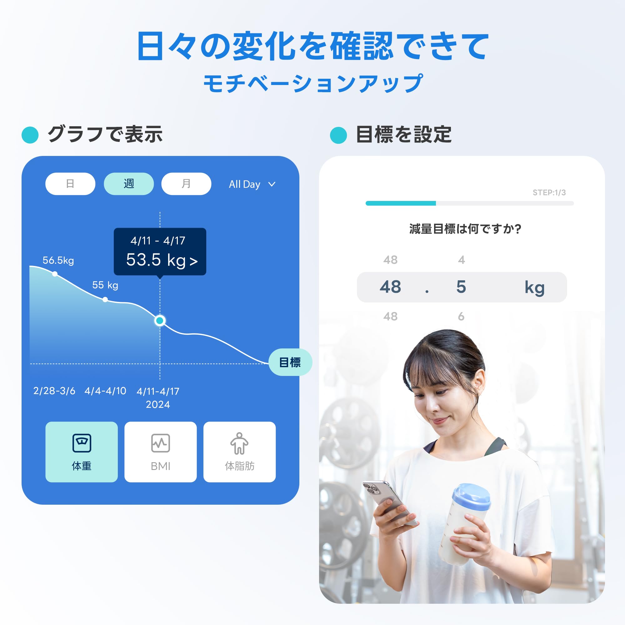 アプリの特徴:自動転送、データグラフ化、運動と食事のアドバイス、計画を設定、ベビーモード、16種類言語対応