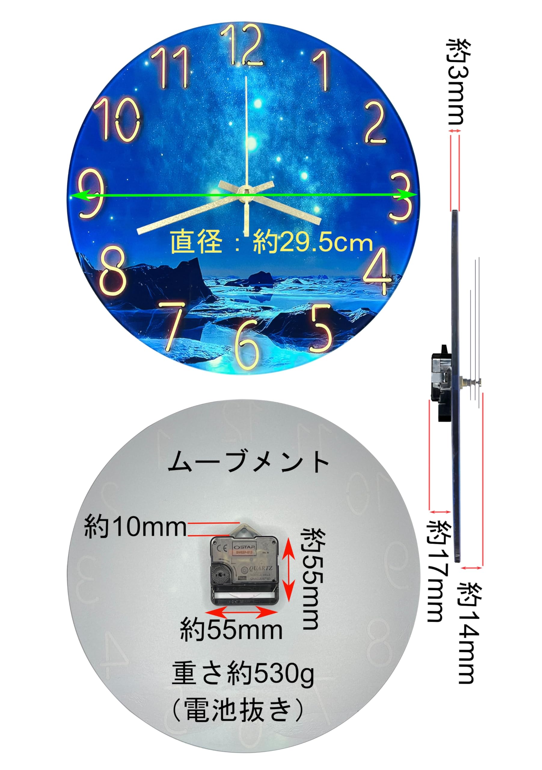 製品概要 :透明なガラス板でできた平坦な文字盤に裏側からきれいな星空の印刷を施したデザイン掛け時計です。