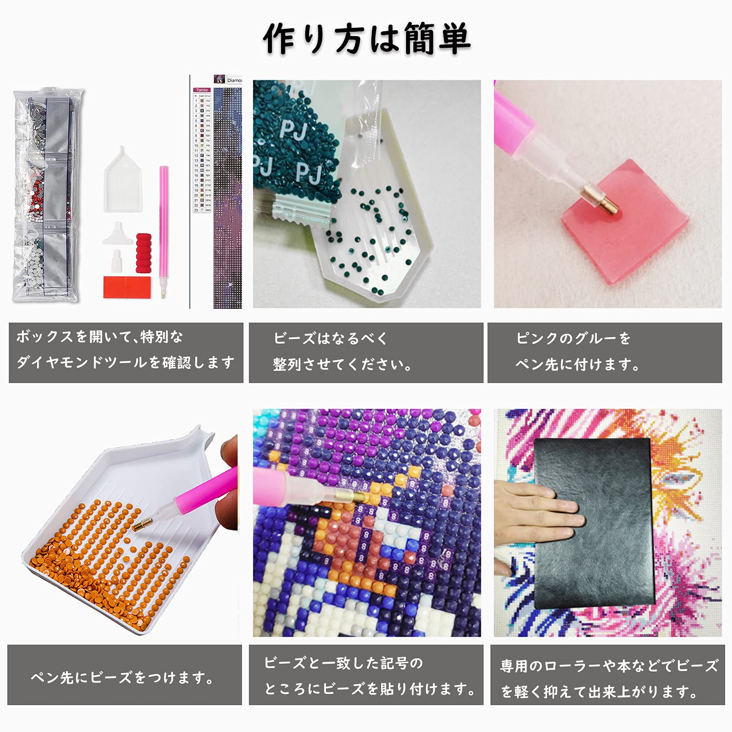 【ダイヤモンドセット内容】1x 5D DIYのダイヤモンドの絵画、1x ダイヤモンドキット、1x ダイヤモンド粘着ペン(2 個ペンアクセサリー )、1xトレー、1x滑り止めカバー、2x 糊(グルー)。ダイヤモンド粘着ペンは2本のペンアクセサリー付き、1/3/9個のダイヤモンドドリルを同時にピックアップできます。そして、滑り止めと疲労防止カバーが付いているので、使用中に滑りにくくなります。