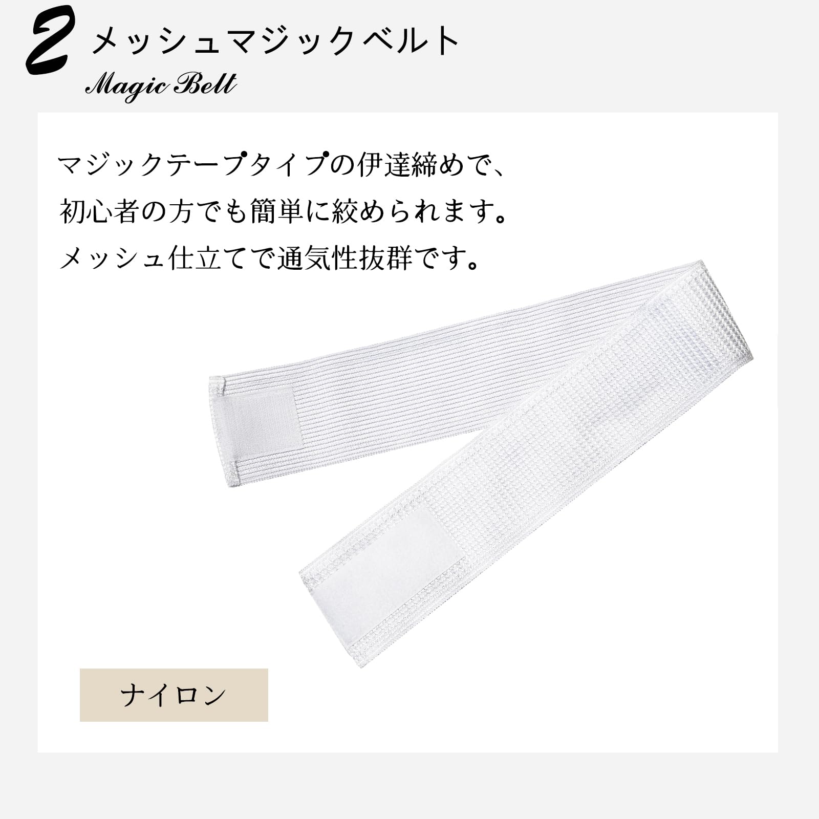 簡単でシワなし:メッシュマジックベルトはマジック付きで初心者でも簡単にきれいに着物を整えます。前板は帯にはりを持たせます。ウエストベルトは腰紐のかわりに前身頃を固定させる役割があります。衿も前身頃も着崩れなしで、花火大会から、パーティー、お祭りなどまでご安心で着物を楽めていただけます。