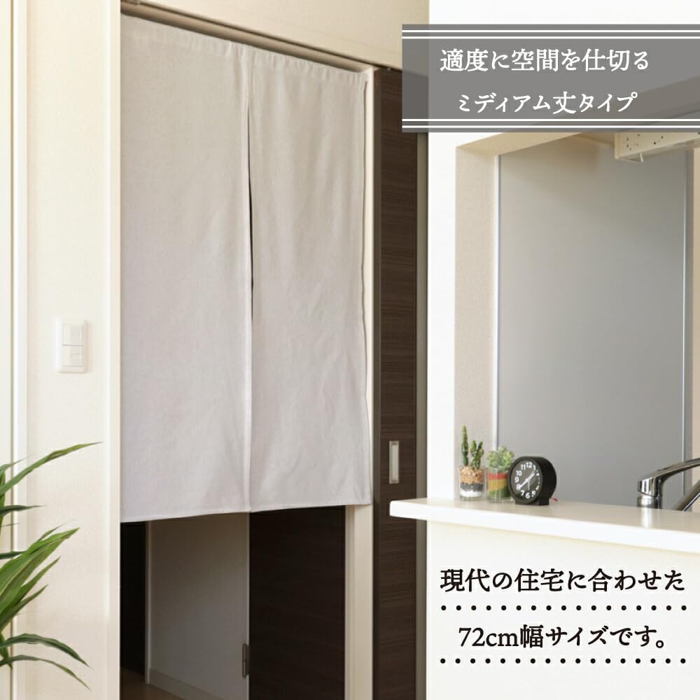 【ポイント】風合いのある綿混生地を使用したナチュラルなのれんです。お部屋に馴染みやすいカラー展開で、和室にも洋室にも奥行きのある和モダンな空間を演出します。現代の住宅幅に合わせた72cm幅サイズで、幅を余らせずにご使用いただけます。お部屋のインテリアにはもちろん、店舗や飲食店にもお使いいただけます。また、プレゼントや贈り物にも大変おすすめののれんです。