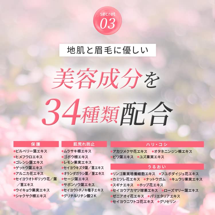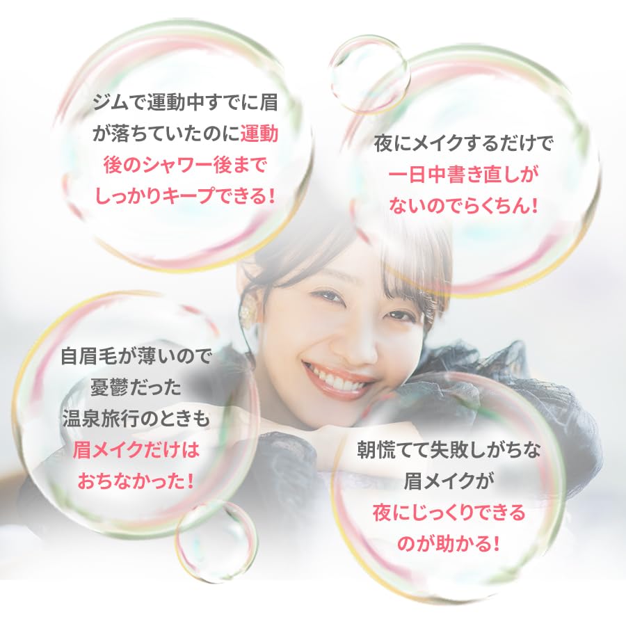 ①落ちにくさ/色素の浸透が良くなるような浸透助剤を配合、色素が肌になじみやすく、ぴったりと肌へと密着して落ちにくい ②肌と眉毛へのいたわり/植物由来の美容保湿成分配合で長時間つけていても安心してお使いいただけます。