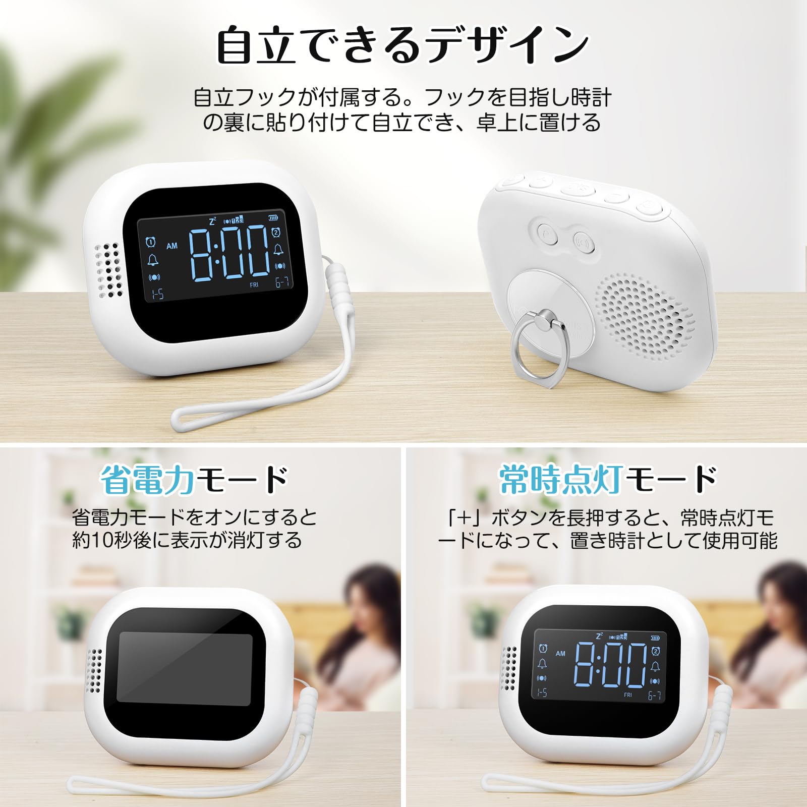 【自立できるデザイン&省電力モード&常時点灯】自立フックが付属します。フックを目指し時計の裏に貼り付けて自立でき、卓上に置けます。省電力モードと常時点灯モードを切り替えることができます。省電力モードをオンにすると約10秒後に表示が消灯します。「+」ボタンを長押すると、常時点灯モードになって、置き時計として使用可能です。