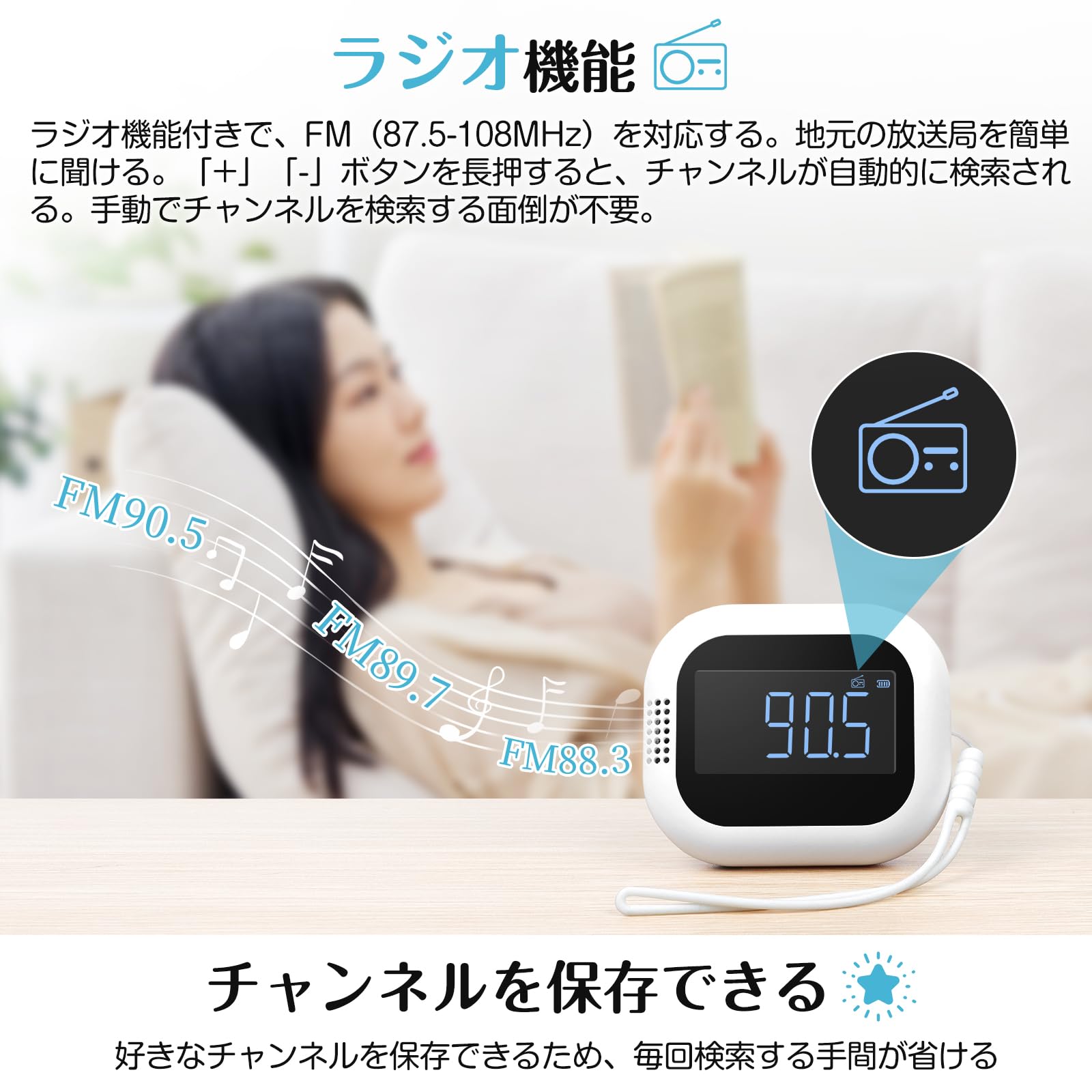 【ラジオ機能&自動検索】ラジオ機能付きで、FM(87.5-108MHz)を対応します。地元の放送局を簡単に聞くことができます。「+」「-」ボタンを長押すると、チャンネルが自動的に検索されます。手動でチャンネルを検索する面倒が不要。そのほか、好きなチャンネルを保存できるため、毎回検索する手間が省けます。