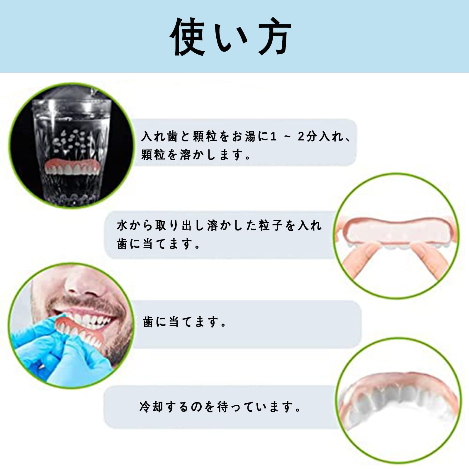 使用方法: 1.歯のゴムが透明になるまで、入れ歯と補歯材料を90度のお湯に入れます。材料の融合を待って、美容歯が柔らかくなり、成形することができます。 2.充填材を義歯の内部に入れ、歯を既存の歯の前部に軽く押し付ける。やけどをしないように気をつけて、温度が下がるのを待ってから操作することができます。 3.力を入れて30秒保持し、歯に密着し、完璧なフィット感を作る。次に歯型を軽く外し、置いて冷まします。 4.密着度に満足していない場合は、必要に応じて強固な密着度が得られるまで何度も再加熱して修正することができます。 お知らせ: 1.入れ歯は歯の外観をすぐに改善するためだけに、トレーニング、喫煙、温かい飲み物を食べたり飲んだりするときに本製品を使用しないように注意してください。 2.寝たり、気分が悪くなったりしたら外してください。 3.1回の装着時間は8時間を超えない