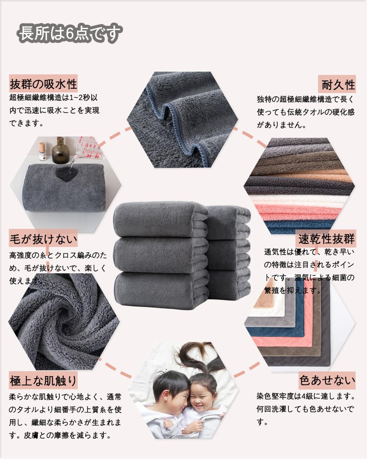 【バスタオル 6枚セット】サイズ:約70×140cm、重量:約300g(1枚あたり)セット内容: グレー6枚。出張、旅行、入浴、ご家族皆さんが満足できます、様々な場合で活躍。