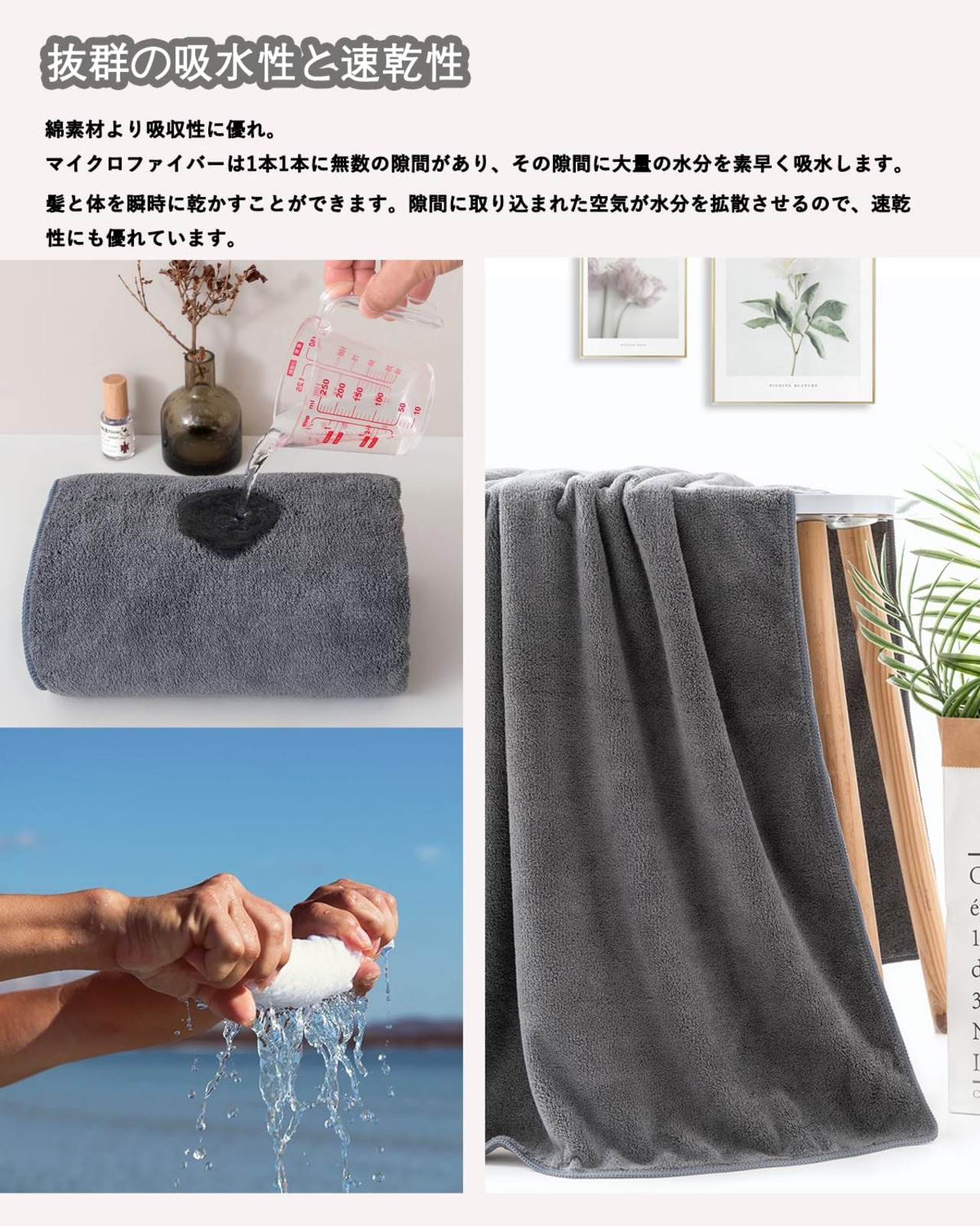 【抜群の吸水性と速乾性】綿の素材より吸水性が優れます。マイクロファイバー素材の表面は数えられない隙間があり、その隙間に大量の水分を素早い吸水できます。髪や肌にそっと当てるだけで水分が吸収される素材であり、また汚れも落としやすい特徴があります。隙間に取り込まれた空気が水分を拡散させるので、速乾性のポイントで、バスタオルの雑菌を抑え、健康を保つことができます。
