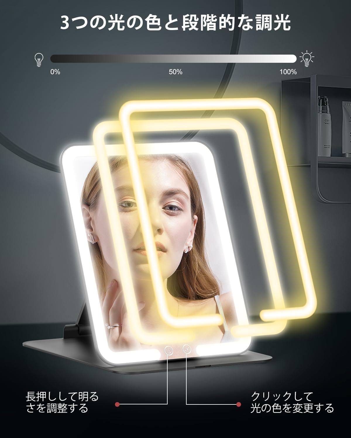 【3種類の光色と無段階調光】当社の照明ミラーを使用して日常のメイクアップ体験を向上させ、3つの異なる光色を選択して任意の環境に合わせることができます- ホワイト、ナチュラル、ウォーム。無段階調光により、明るさを簡単に調節し、希望する照明レベルを実現できます。
