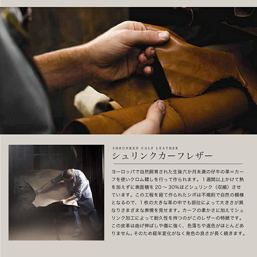 素材には美しく色落ちや色褪せがほとんど無い、かつ傷が目立ちにくいのが特徴のシュリンクカーフレザーを採用。世界中のブランドから評価される高級本革です。