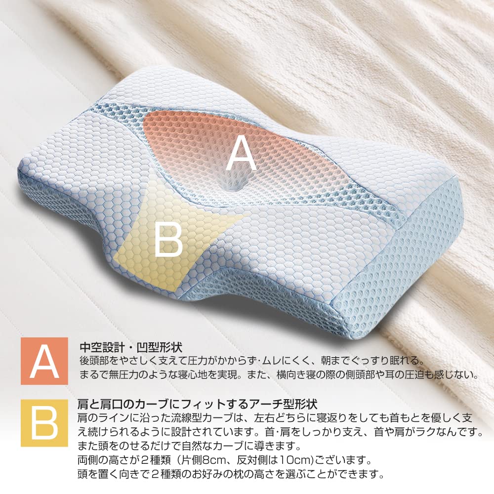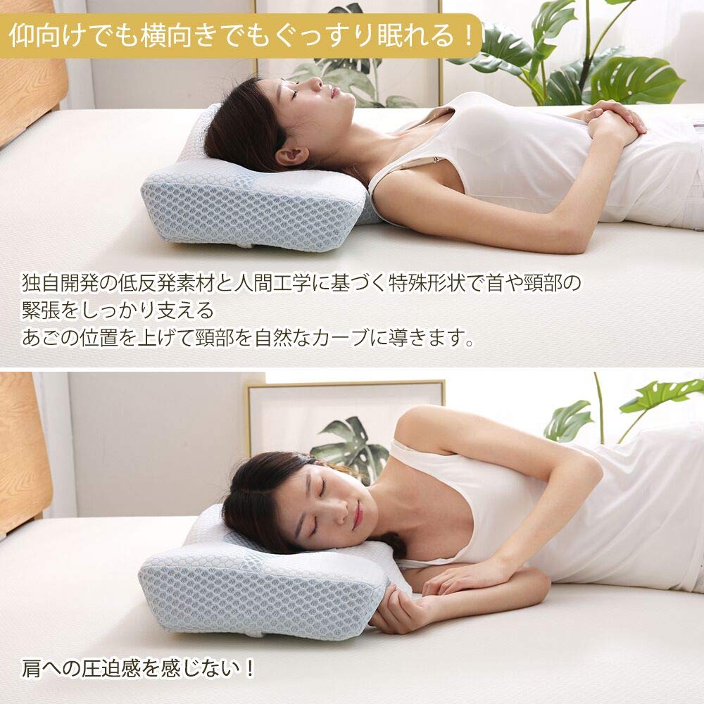 【仰向き 横向きでもラク、高さ調整可能】仰向けで寝る場合、中空設計+くぼみ形状により、頭部への圧力をかからず、寝姿勢を安定。 横向けで寝る場合、中空設計で横向き寝の際の側頭部や耳のあっぱく感を感じない。 様々な体型に配慮されたがオリジナルの枕は首を乗せる部分は左右で高さを変えてありますので、ご自分の体型に合わせて使い分けて頂けます。