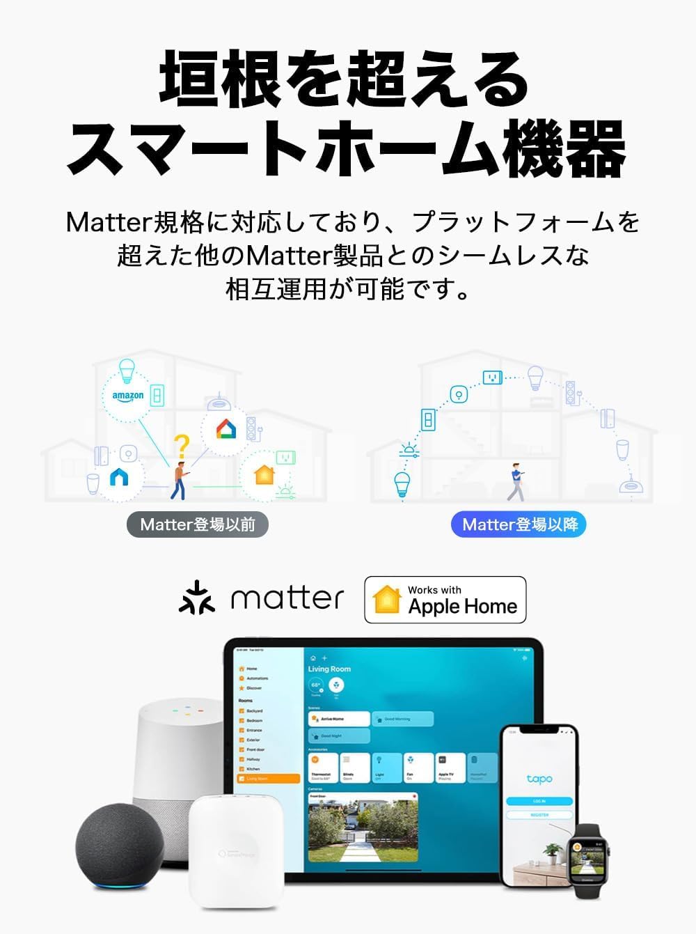 [Matter 対応] Matter規格に対応しており、プラットフォームを超えた他のMatter製品とのシームレスな相互運用がで可能です。