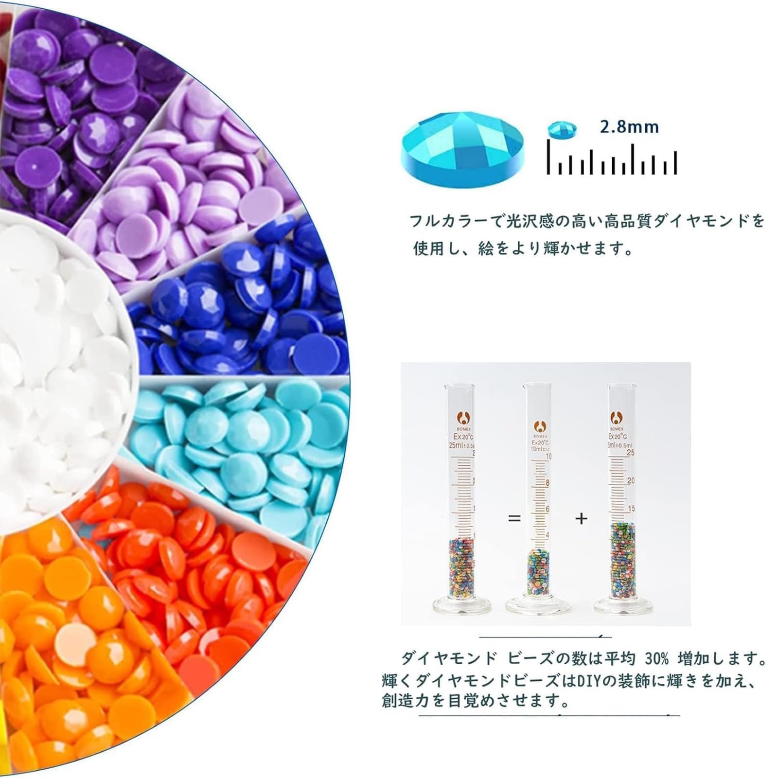 【ダイヤビーズ+30%】:ダイヤモンドアート 花と蝶 キット。キラキラと輝くダイヤは色鮮やかで色褪せません。 さらに、ダイヤモンドの不足を避けるために、ダイヤモンドの数を30%増やしました。