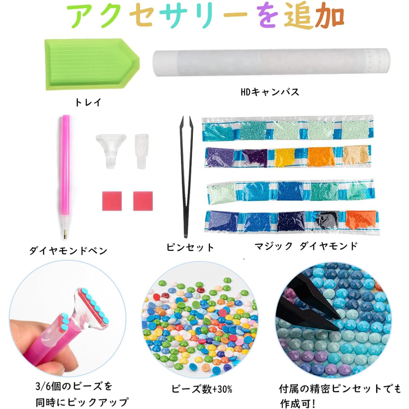 【ダイヤモンド絵画-簡単に作成】:ダイヤモンド粘着ペンは2本のペンアクセサリー付き、1/3/6個のダイヤモンドドリルを同時にピックアップできます。ペン先をピンクのグルーを付けて台紙にビーズと同じ記号または英数字を貼り付けるだけでキラキラなダイヤモンドアートが仕上がります。クロスステッチ刺しゅうより気軽になり、集中力がUP、達成感もじゅうぶん味わっていただけます。